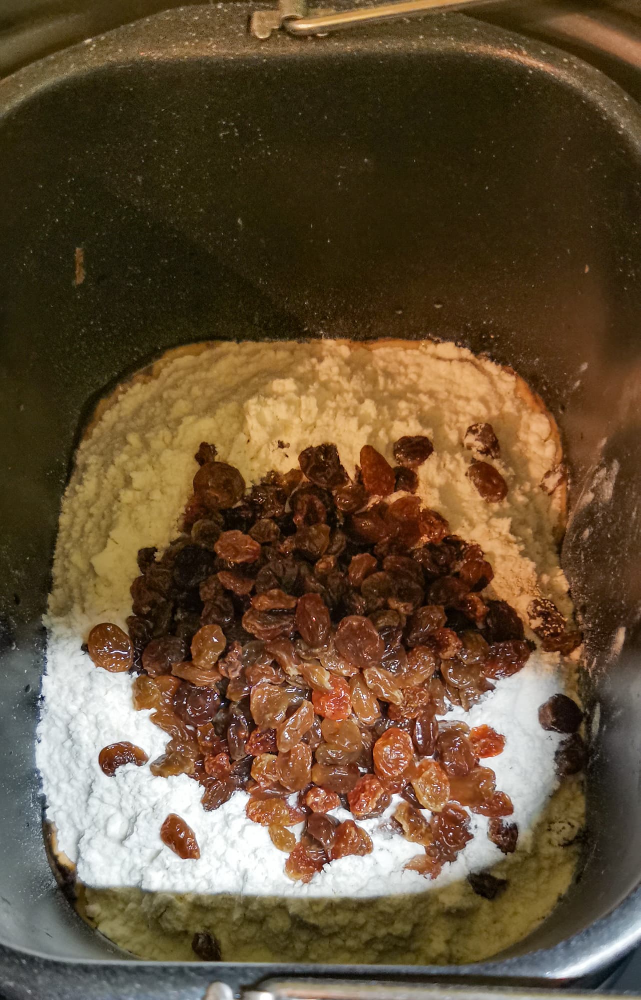 За основу мы взяли рецепт 1 на 700 г, но заменили 20% пшеничной муки на солодовую, добавили сахара, положили около 200 г изюма, немного увеличили количество воды (так как изюм использовали не замоченный, а только промытый).
