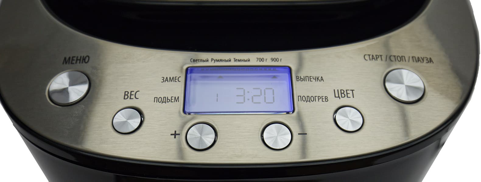 Прибор управляется с помощью 6 кнопок, расположенных спереди на верхней стороне корпуса. Над кнопками светодиодный дисплей с информацией о текущей программе прибора. На экране отображается номер программы, время программы, предпочтительный цвет корочки и вес буханки. По умолчанию на дисплее выставлены значения основной (1) программы из 12.