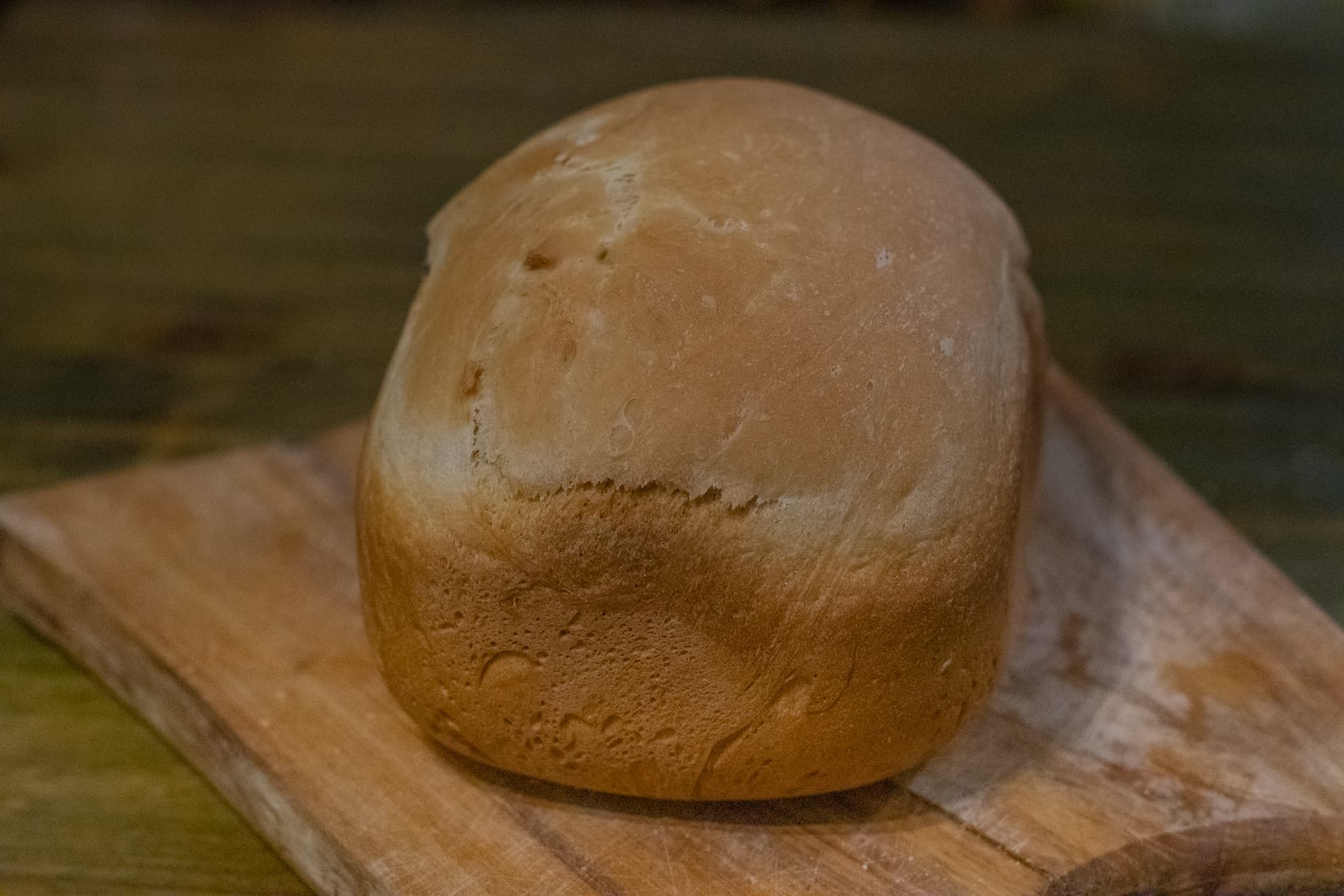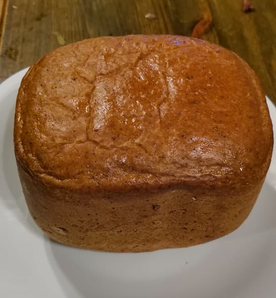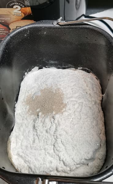 Мы решили немного изменить рецепт и добавили примерно 10% муки, вместо воды взяли молоко и немного уменьшили количество дрожжей. Выставили программу 9, но не на 700 г, а на 900 г, темную корочку.