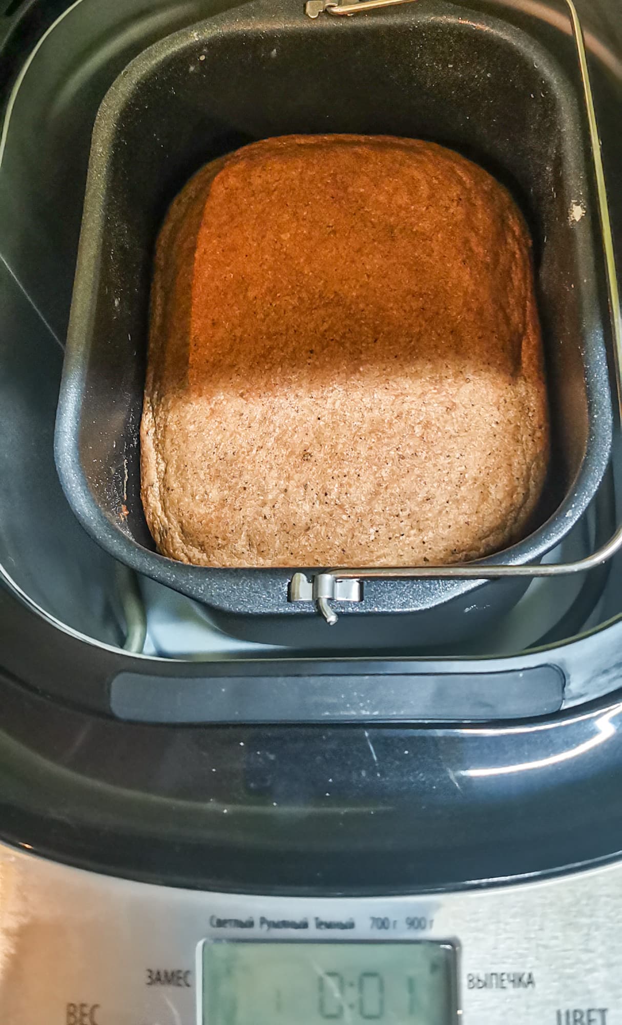 Выставили программу 1, 900 г, среднюю корочку. Хлеб после приготовления вынули только через 5 часов, так что остывал он в хлебопечке и был чуть теплый.