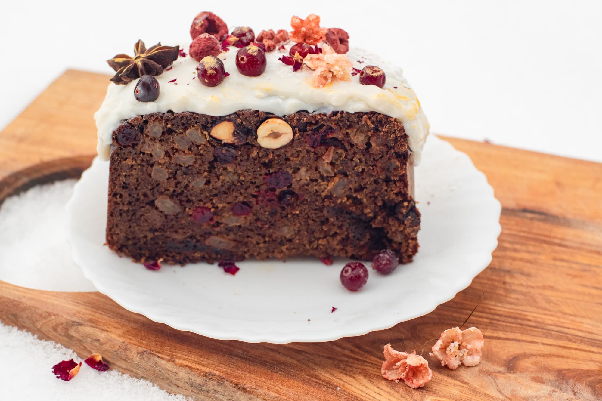 Когда кекс остыл, мы украсили его помадкой и ягодами сверху. При разрезании мякоть ведет себя совсем по-другому — она не крошится, хорошо держит форму. Такой кекс может служить основой к морковному торту или быть рождественским кексом на праздничном столе.