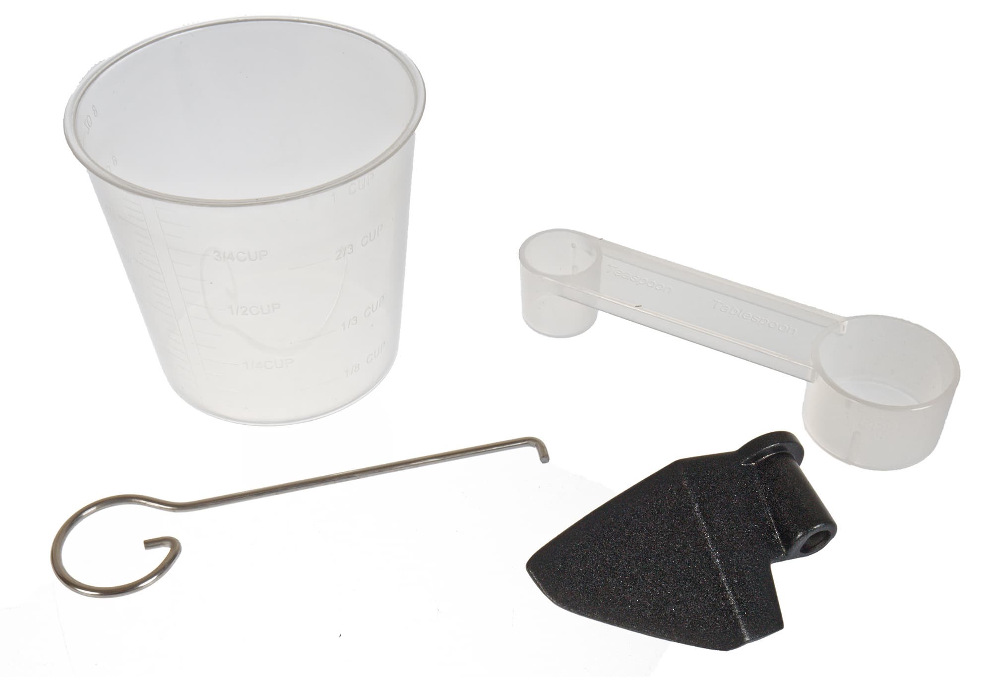 В комплекте с прибором идут аксессуары — мерная ложка, мерный стакан и крюк для извлечения лопатки из теста. Этим же крюком можно доставать горячую форму из хлебопечки за ручку.