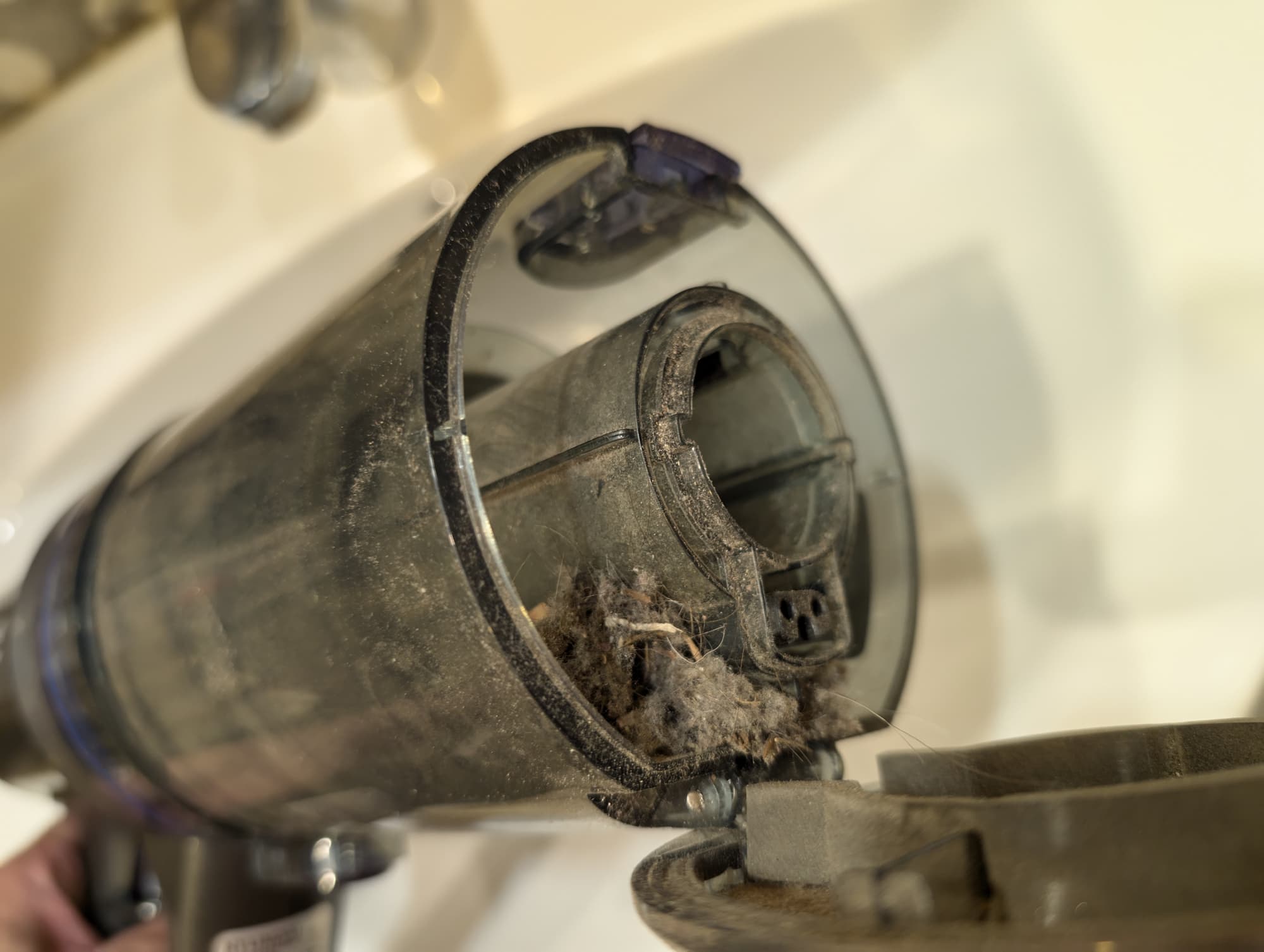 Выступ внутри циклона, в котором проходит провод питания щетки, уменьшает полезное пространство и может служить бутылочным горлышком, где скапливается мусор. Образующаяся пробка снижает эффективность циклонного фильтра: за это мы снижаем один балл при оценке качества фильтрации.