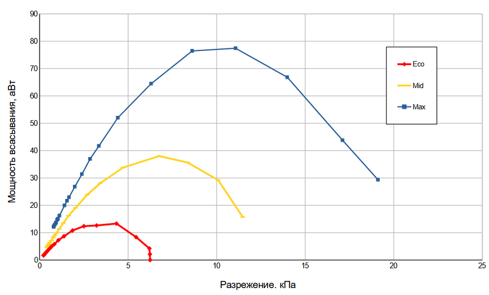 На максимальном и среднем уровнях мощности при полном закрытии заслонки стенда срабатывает защита от перегрева: это можно видеть на синем и желтом графиках. Измеренная нами мощность всасывания составила 13,3 аВт в минимальном режиме, 38,0 аВт — в среднем и 77,4 — в максимальном.