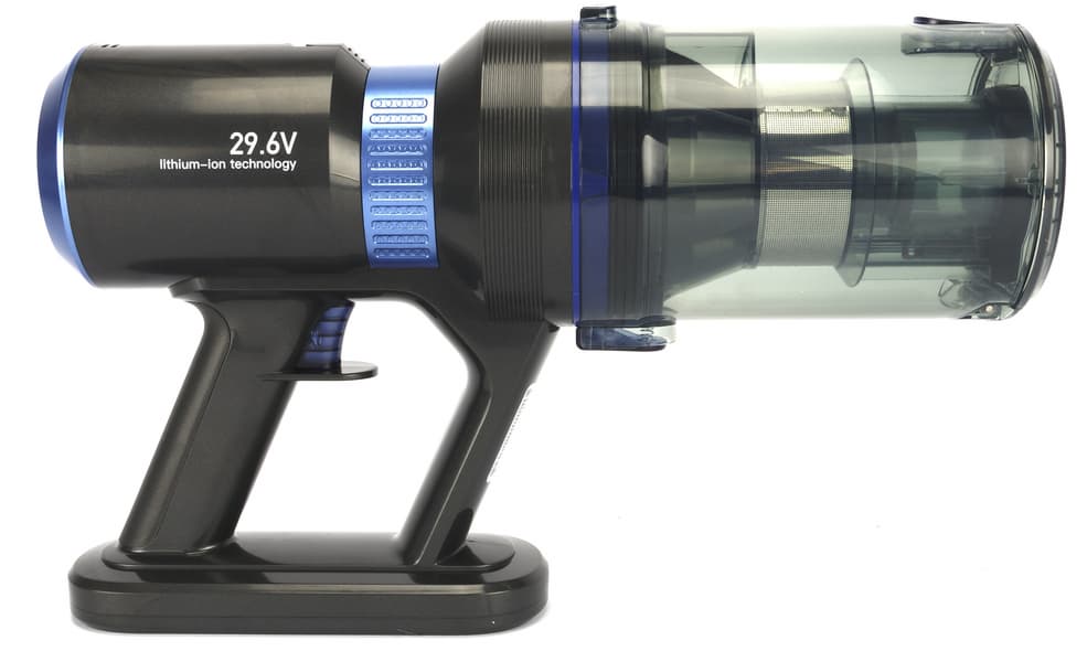 Эта модель выполнена по продольной схеме: циклонный фильтр располагается на одной оси с воздушным трактом. Сразу за контейнером для мусора размещен двигатель, а цилиндрический аккумулятор крепится к заднему торцу моторного блока. Между двигателем и аккумулятором справа и слева можно видеть отверстия для выхода воздуха.