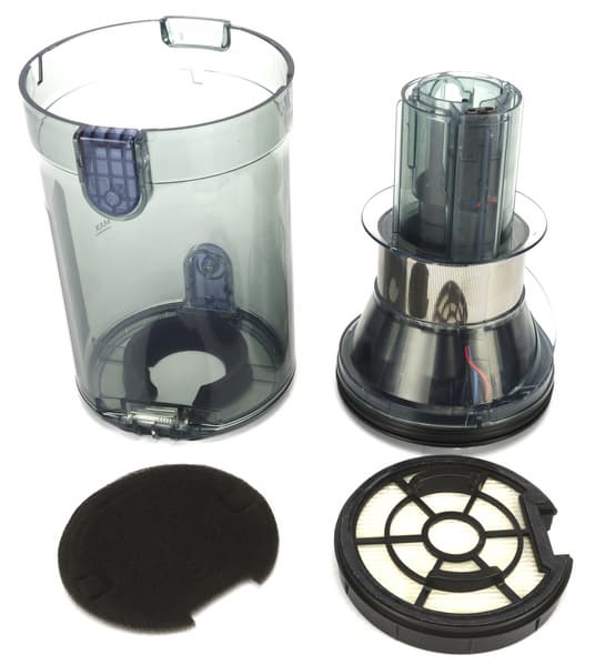 Провода от контактов проходят внутри прозрачного неразборного циклонного элемента и заканчиваются розеткой воздушного тракта. Поток воздуха с пылью и мусором поступает в контейнер, закручивается вокруг циклона и разделяется по фракциям: крупные и тяжелые фрагменты остаются в стакане, а пыль среднего размера оседает на стальной решетке в центральной части. Затем воздух проходит через предварительный фильтр из черного поролона и, наконец, достигает элемента тонкой очистки — дискового HEPA класса H13.