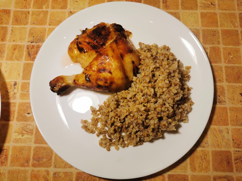 Мы немедля подали куриные ножки с горячей гречей к столу и осчастливили наших дегустаторов.