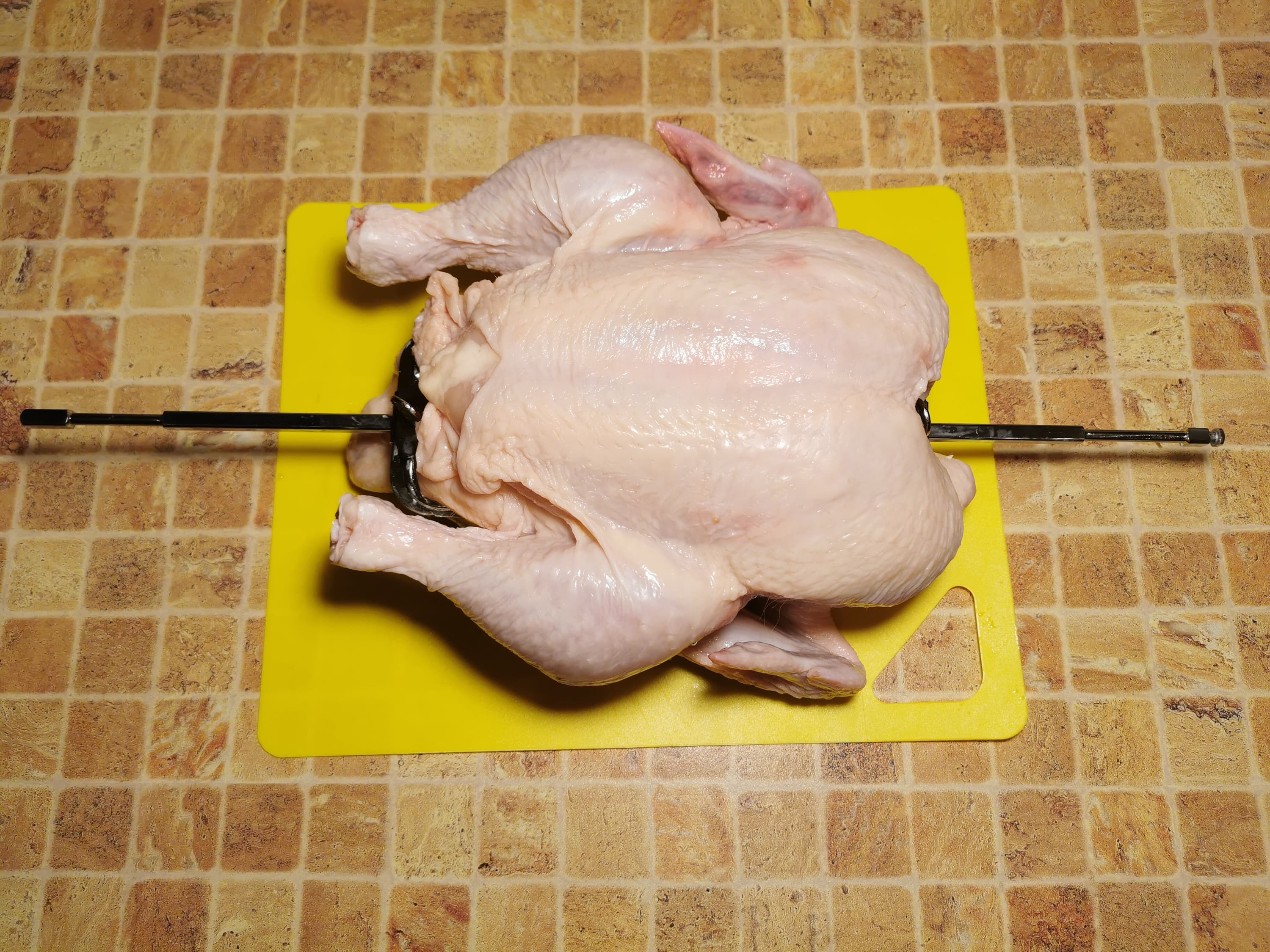 Для этого мы взяли целую тушку цыпленка, насадили на вертел и закрепили с помощью двух зажимов, оснащенных винтами.