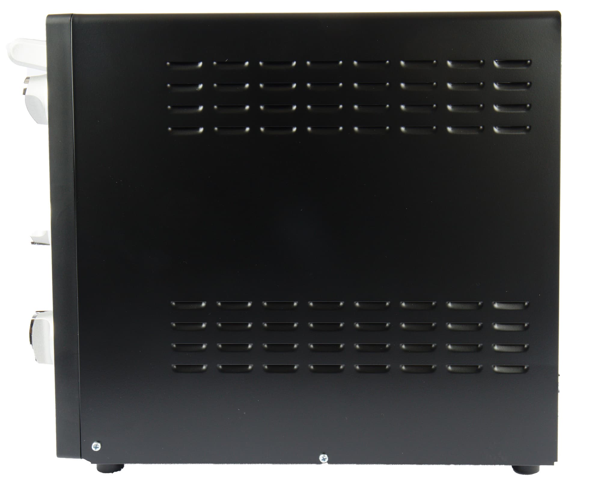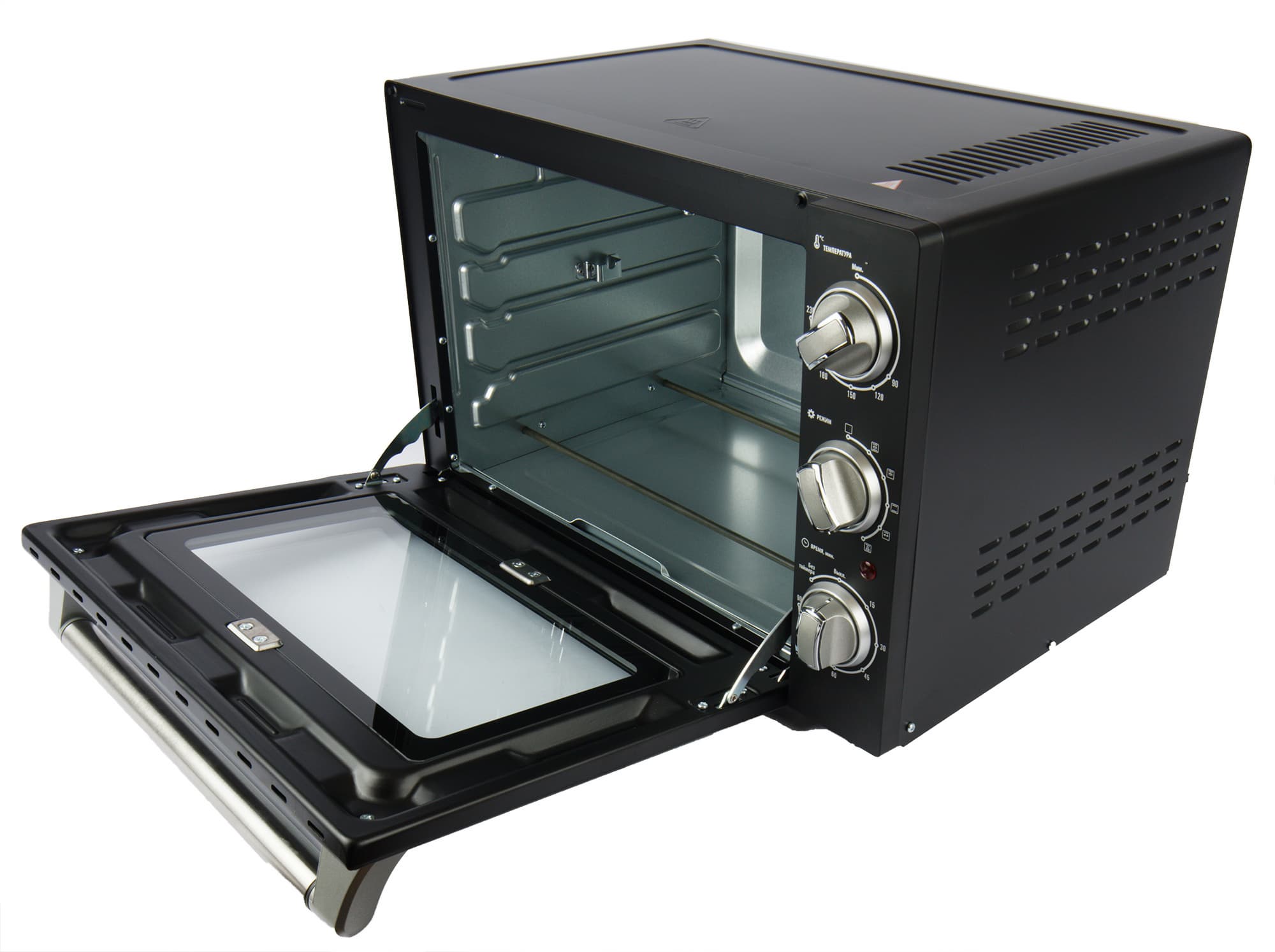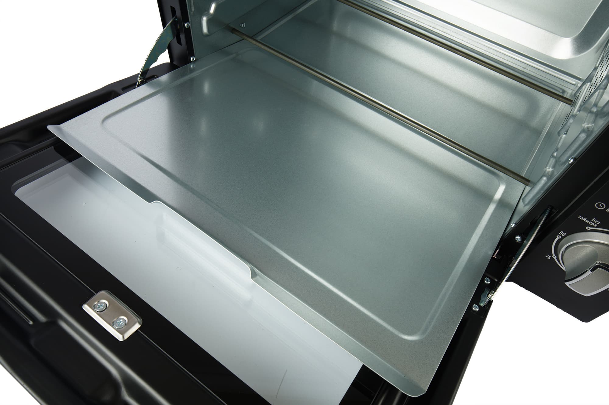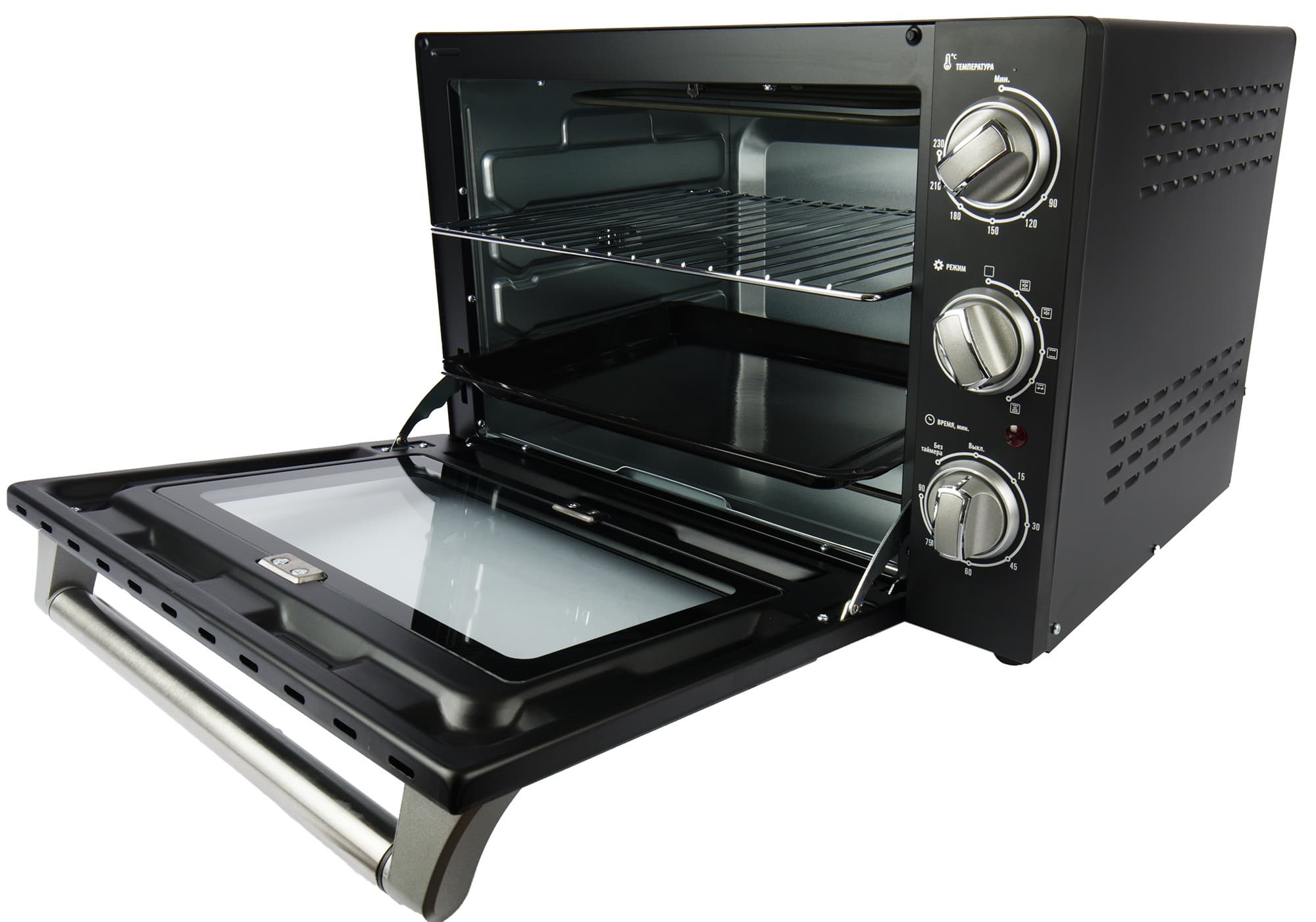 Большую часть передней стороны печи занимает дверца из прозрачного закаленного стекла, через которую хорошо видно содержимое камеры. На дверце расположена металлическая ручка, обеспечивающая плавное и легкое открывание/закрывание, а также удобное фиксирование дверцы в 3 положениях.