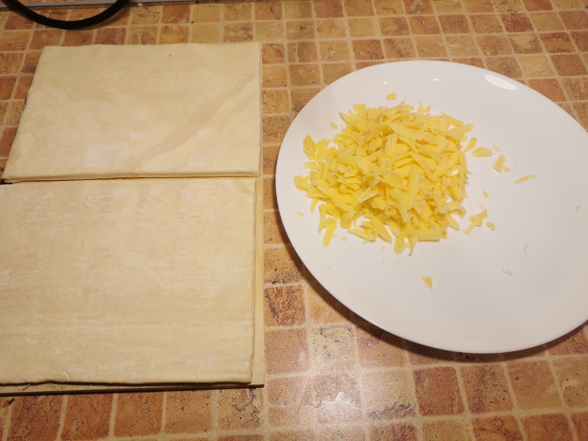 Нам понадобилась одна упаковка замороженного теста, которую мы предварительно разморозили, а также 50 граммов натертого сыра.