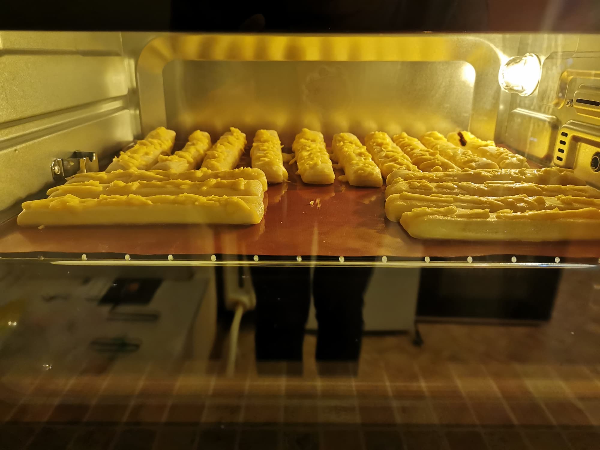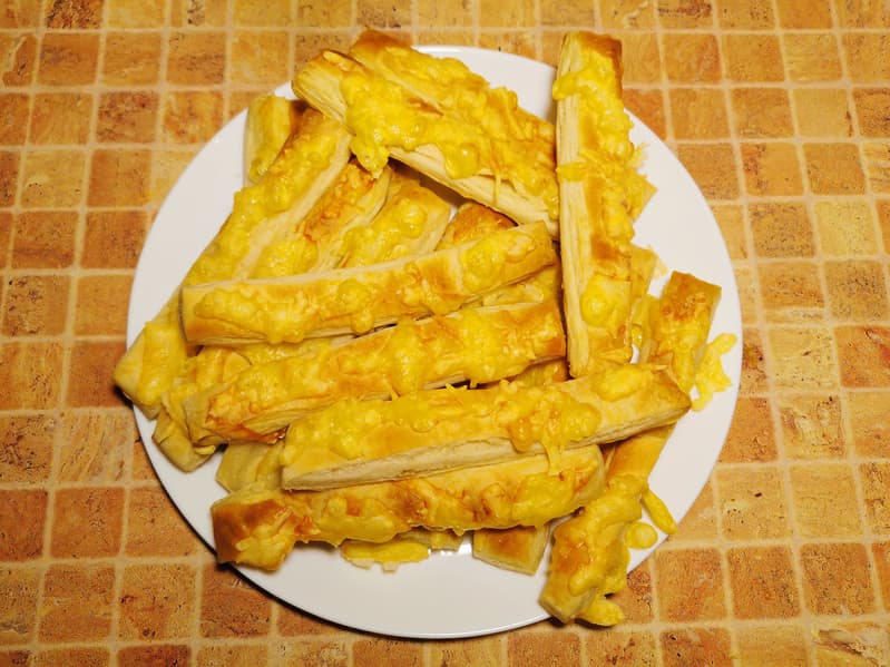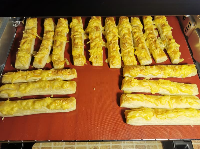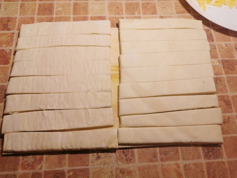 Тесто мы нарезали полосками, выложили его на противень, посыпали сыром и отправили в разогретую до 190 °C печку.
