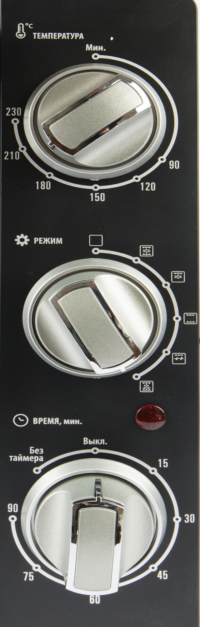 Третья ручка включает/выключает установку таймера во время приготовления. При повороте вправо от отметки «Выкл.» можно установить точное время работы печи от 15 до 90 минут с шагом в 15 минут, либо установить время между шагами, угадывая примерное значение. При повороте ручки влево таймер можно отключить и тогда устройство будет работать без таймера.