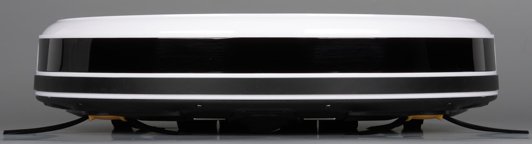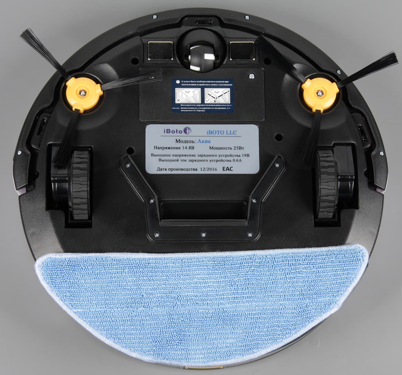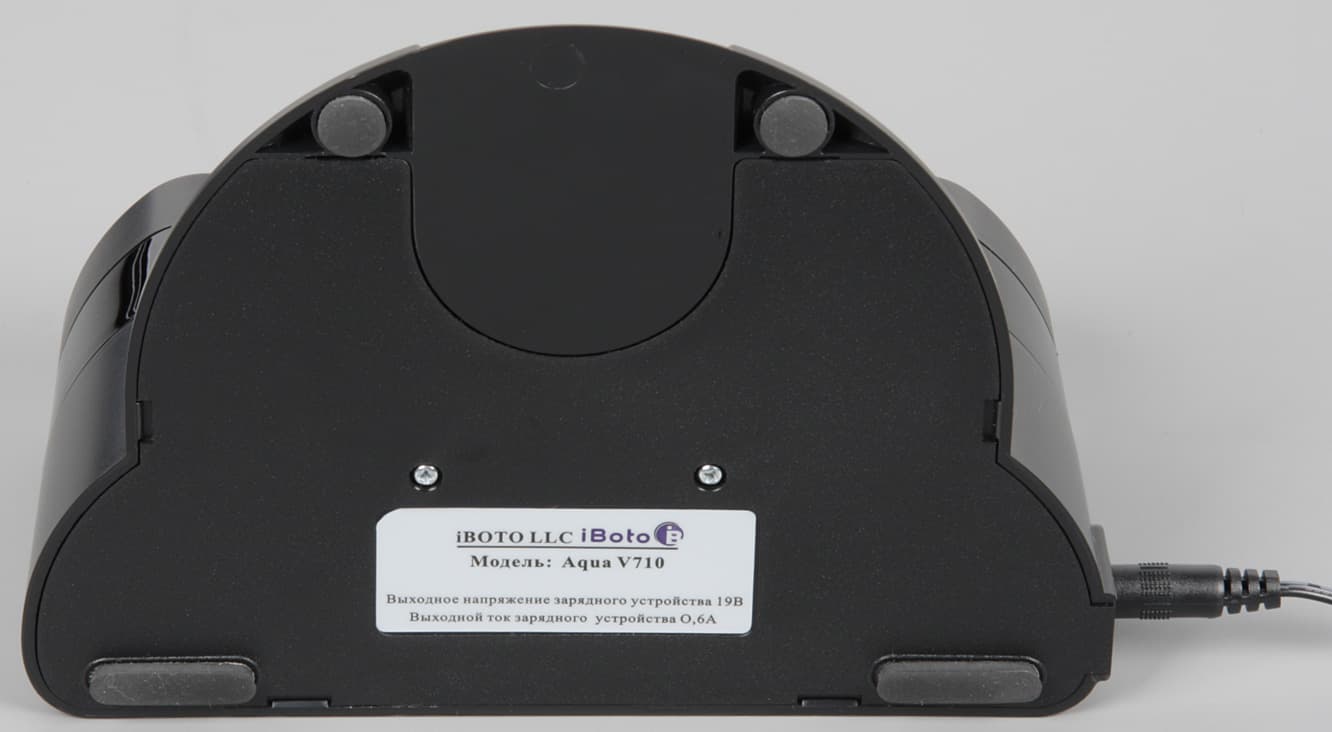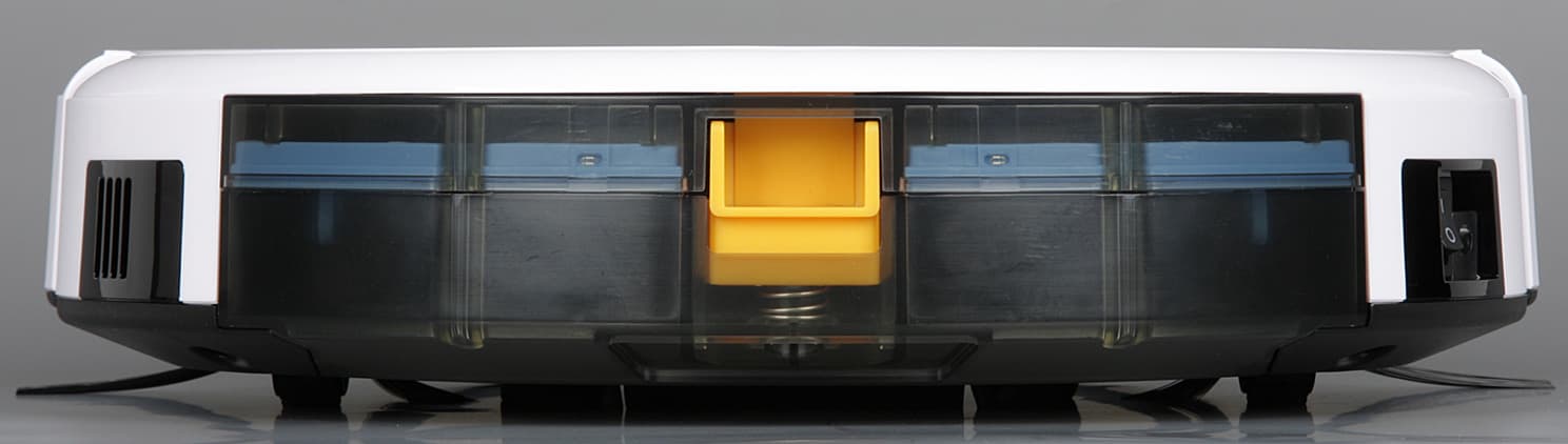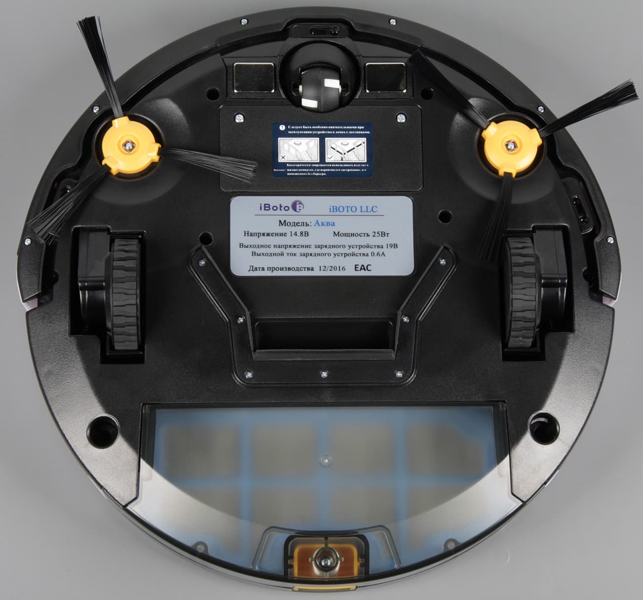 На днище находятся две контактные площадки, передний опорный поворотный ролик, крышка батарейного отсека, две боковые щетки, всасывающее отверстие, обрамленное резиновыми скребками, и два ведущих колеса. Спереди ближе к краю расположены три ИК-датчика перепада высоты, благодаря которым робот-пылесос может избежать падения со ступенек.