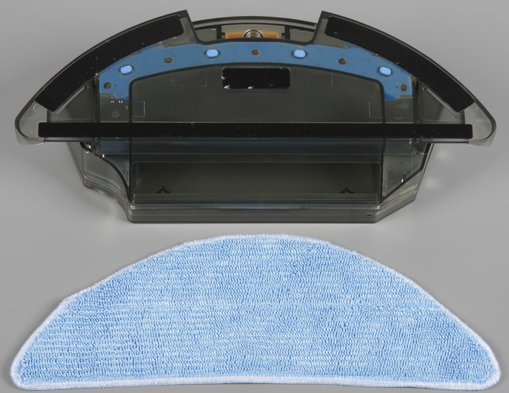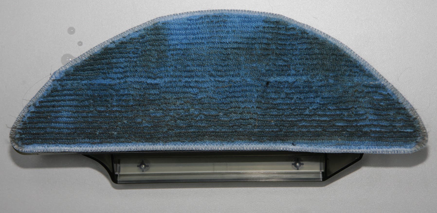 Тестирование в режиме влажной уборки с установленным специальным контейнером показало, что за час работы расходуется порядка 170 мл. След на полу от робота слегка влажный и быстро высыхает. Салфетка загрязняется равномерно, за исключением места под выемкой на дне контейнера в области защелки, фиксирующей контейнер на корпусе робота.