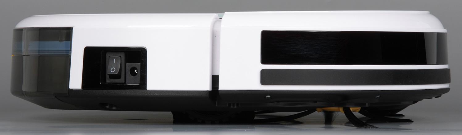 Масса робота равна 2460 г (с пылесборником для сухой уборки). Диаметр корпуса, согласно нашим измерениям, составляет 325-329 мм. Оси ведущих колес расположены на одном диаметре окружности корпуса, это позволяет роботу совершать разворот на месте без изменения границ, занимаемой им площади. Положительную роль играют относительно небольшая высота, равная 80 мм, и гладкий по периметру корпус. Ведущие колеса диаметром 60 мм оснащены резиновыми покрышками с выраженными грунтозацепами. Колеса установлены на подпружиненных шарнирах с ходом в 19 мм, что также улучшает способность робота преодолевать препятствия. Боковые щеточки имеют длинную и жесткую щетину, пучки которой выходят непосредственно из желтых пластиковых колпачков, насаженных на оси приводов. На месте щеточки фиксируются на защелках, поэтому для их снятия и установки инструмент не нужен. Отметим, что редукторы приводов щеток и колес позволяют их проворачивать рукой, это очень помогает, когда нужно вытащить робота, например, из под дивана, под которым он застрял, или распутать что-то намотавшееся на колеса или щеточки.