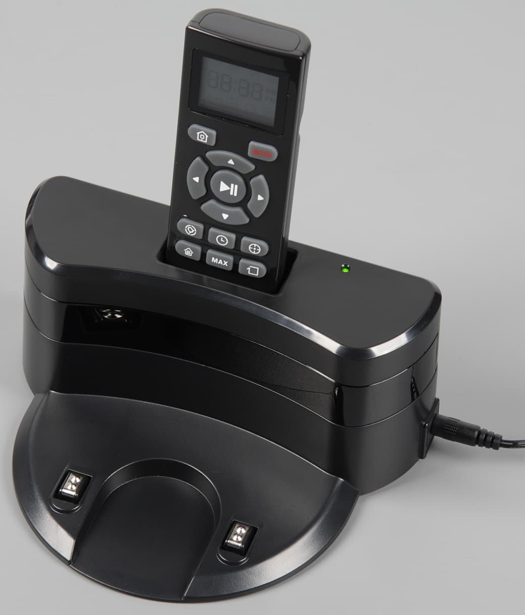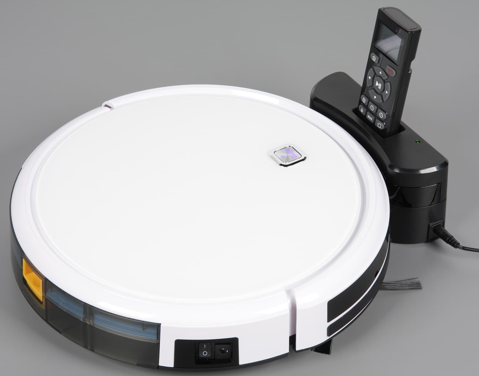 База, на которой пылесос заряжается, имеет относительно большое основание. Сверху на базе есть углубление, предназначенное для хранения комплектного пульта ДУ.