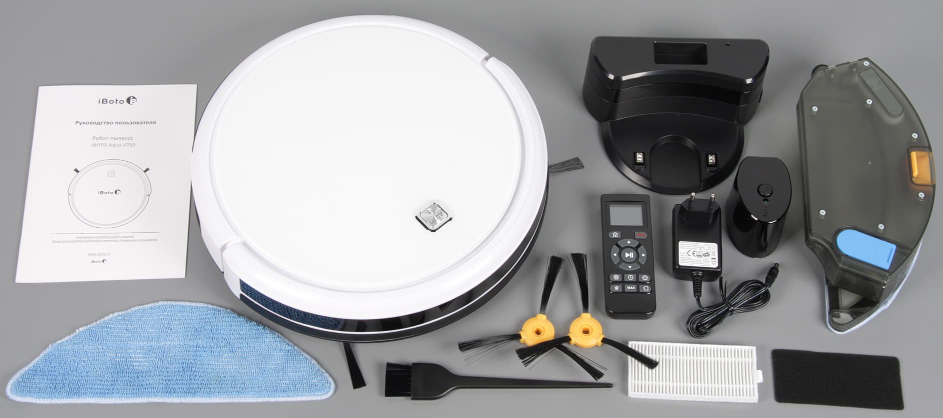 Две боковые щеточки и высокая мощность всасывания обеспечивают роботу-пылесосу iBoto Aqua V710 хорошую эффективность уборки. В автоматическом режиме этот робот убирает, попеременно меняя алгоритм движения, и сам возвращается на базу для зарядки аккумулятора. Также пользователь может вручную управлять движением робота, включать режим повышенной мощности всасывания, режим следования вдоль стен, выбирать вариант уборки в одной комнате с ограничением по времени уборки и режим интенсивной очистки локального участка, кроме того робота можно запрограммировать на ежедневную уборку в заданное время. Функциональность робота дополнена способностью выполнять влажную уборку. Для этого взамен обычного пылесборника нужно установить специальный контейнер с резервуаром, предварительно заполненным водой, а на днище этого контейнера следует закрепить чистящую салфетку, которая во время движения робота увлажняется жидкостью из резервуара и протирает пол.