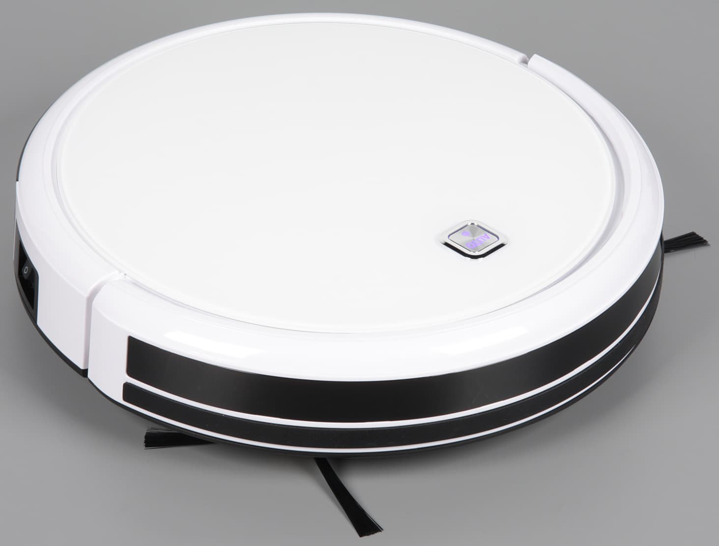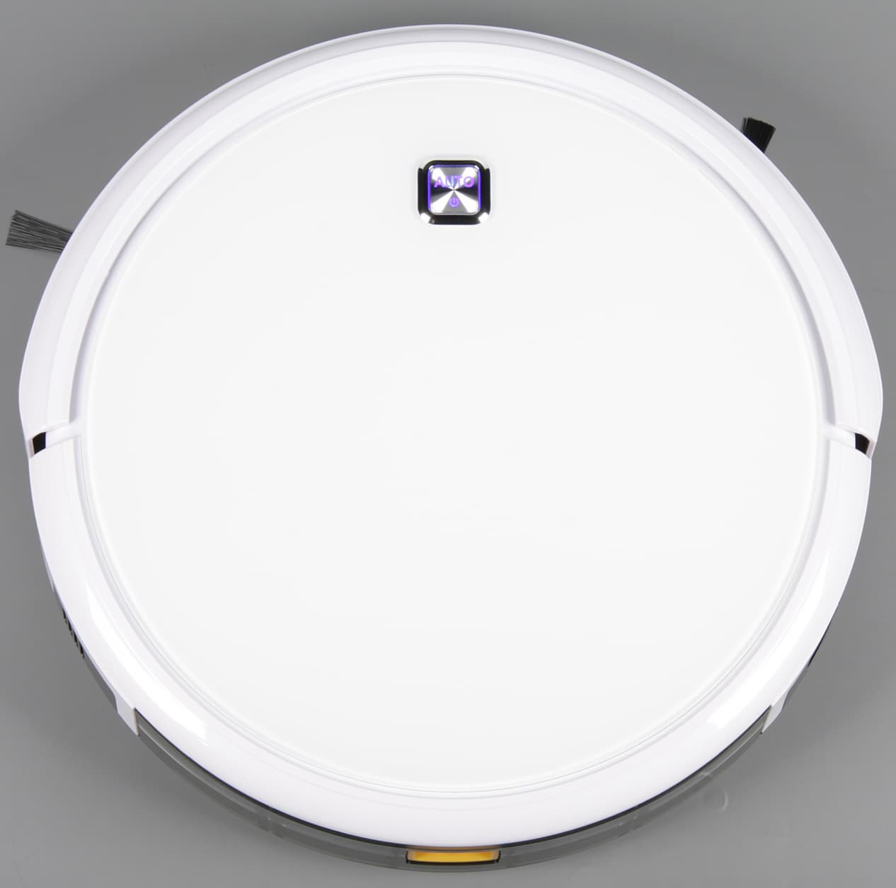 Отметим, что светлого робота проще найти в темных закоулках квартиры, когда он по какой-то причине не вернется на базу. Верхняя панель прикрыта пластиной из минерального закаленного стекла, поэтому она не царапается и легко очищается. На верхней панели ближе к передней части есть единственная механическая кнопка с подсвечивающимся словом Auto и значком питания.