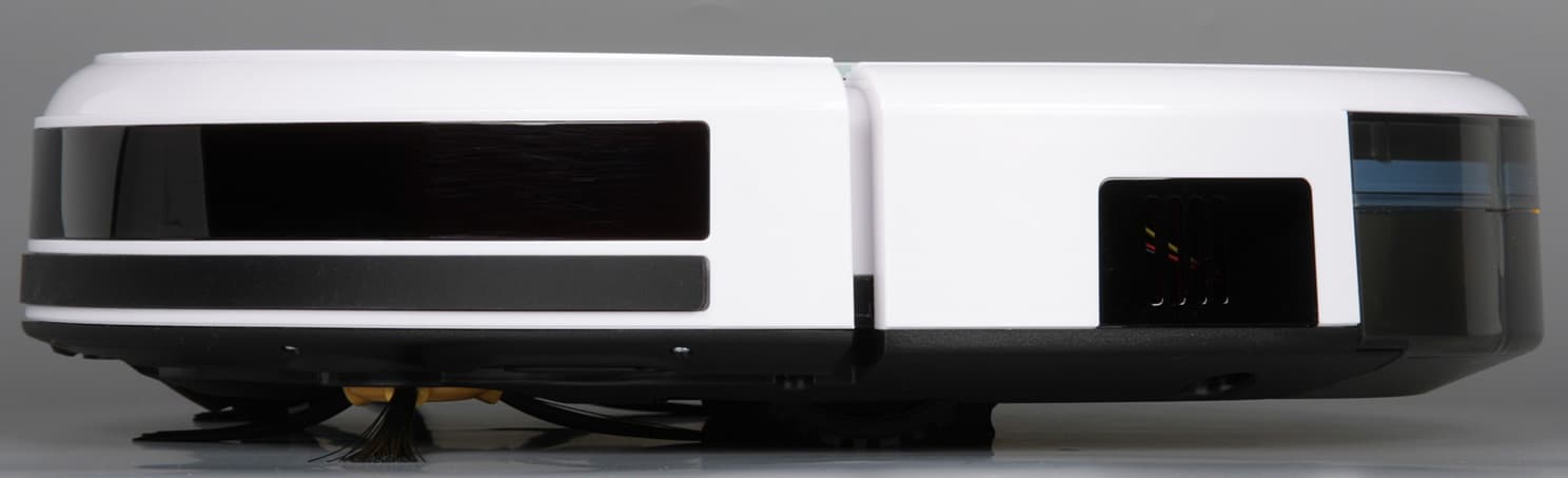 Выраженный бортик сверху на бампере снижает вероятность того, что робот застрянет под низкими предметами обстановки, например, под диваном. Сдвиг бампера вызывает срабатывание механических датчиков препятствий. Для защиты мебели спереди на бампер в нижней его части наклеена полоса из резины средней жесткости. Выше на бампере за окошком из тонированного пластика находятся ИК-датчики обнаружения препятствий, базовой станции и, возможно, приемник команд с пульта ДУ. Что-то из перечисленного, видимо, также расположено за тонированными окошками на корпусе за бампером ближе к задней части пылесоса. Нажав на желтый фиксатор сзади, можно отсоединить пылесборник от корпуса робота.