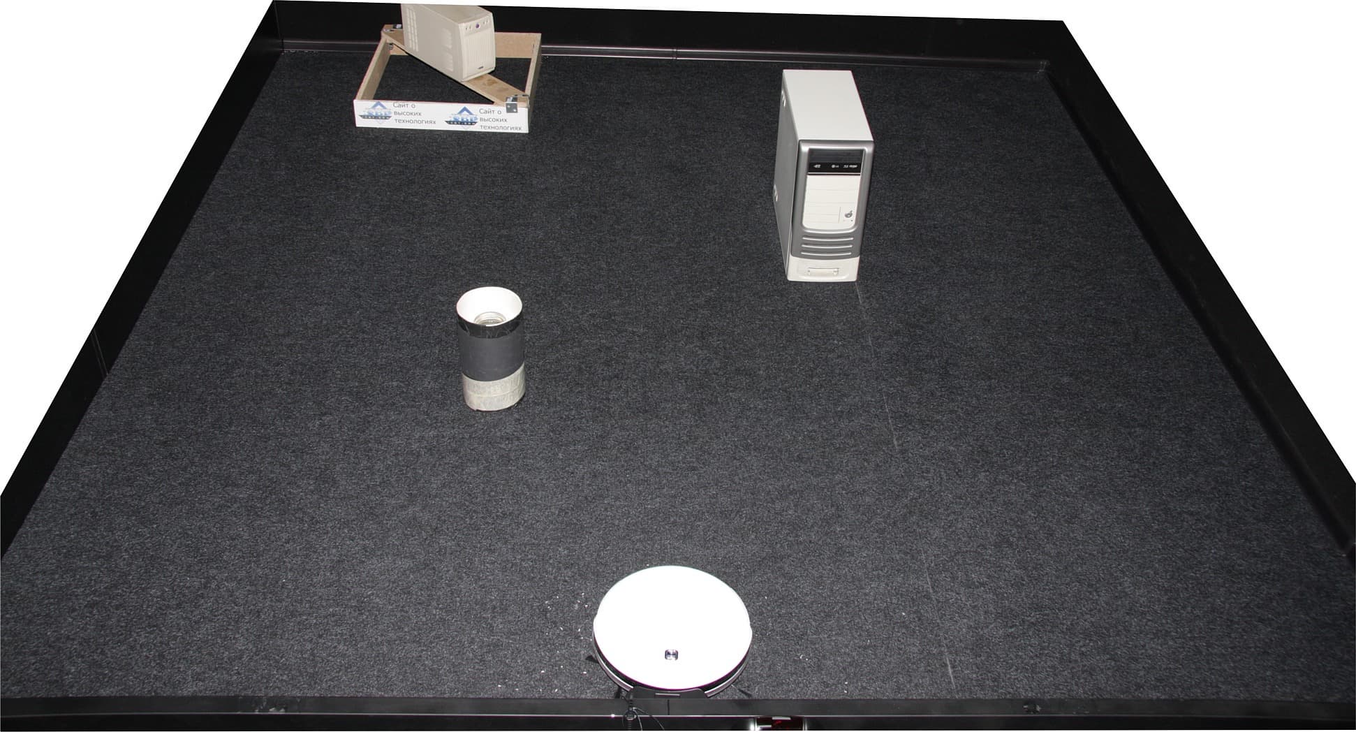Загон шире робота всего на 5 см, но это не помешало роботу заехать туда несколько раз. Робот объезжает базу с запасом по расстоянию, поэтому не толкает ее и не сдвигает с места, однако и мусора около базы остается относительно много. Между высокими вертикальными и хорошо отражающими ИК-лучи стенками и корпусом робота обычно остается небольшой зазор, тогда как к низким, наклонным (например, к плинтусу) или черным в ИК-свете стенкам робот подъезжает вплоть до срабатывания механического датчика в бампере. Почти полностью разрядив аккумулятор, робот выключает вентилятор, снижает скорость движения и скорость вращения боковыми щеточками и начинает искать базу. Видео ниже это демонстрирует: