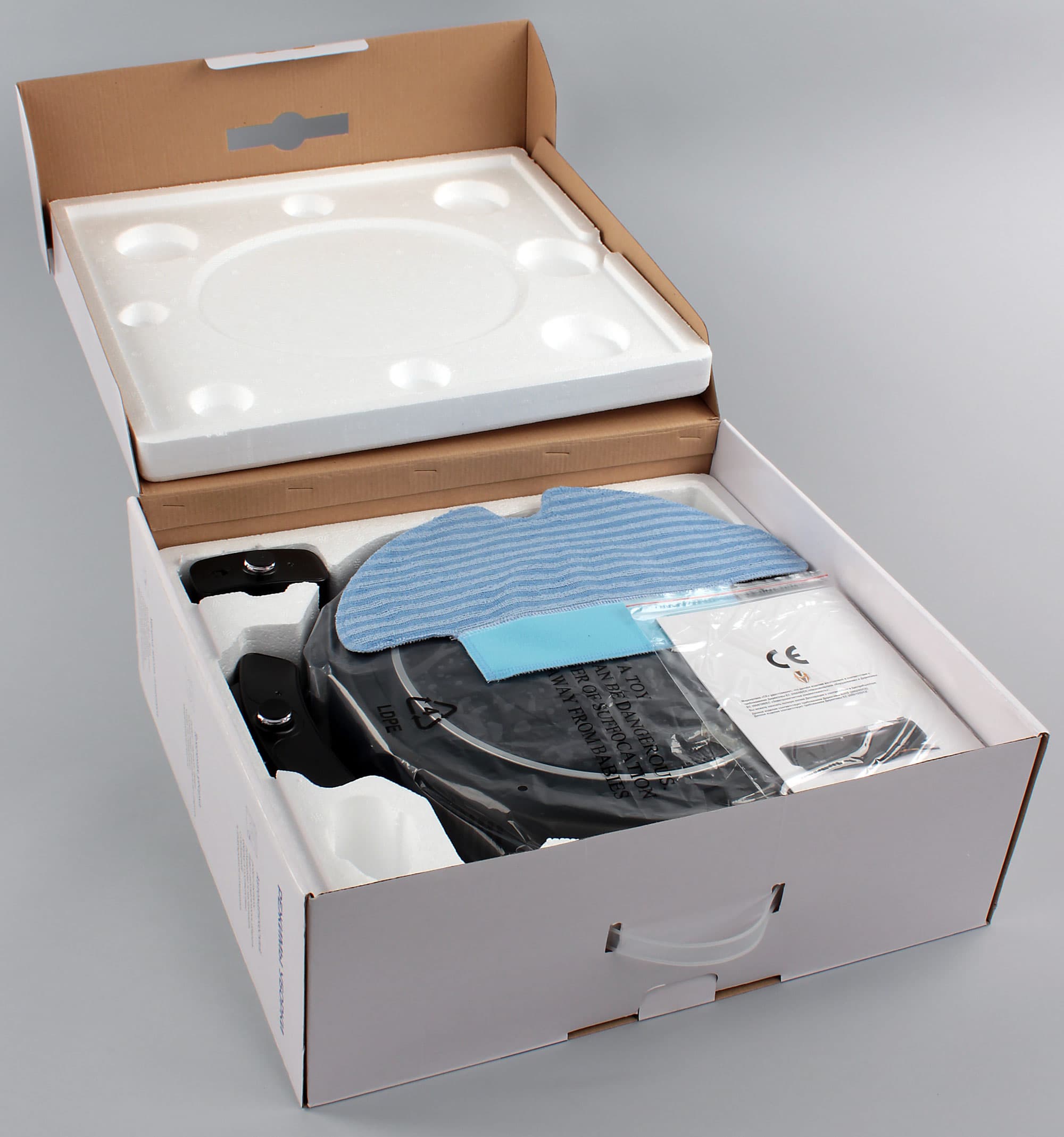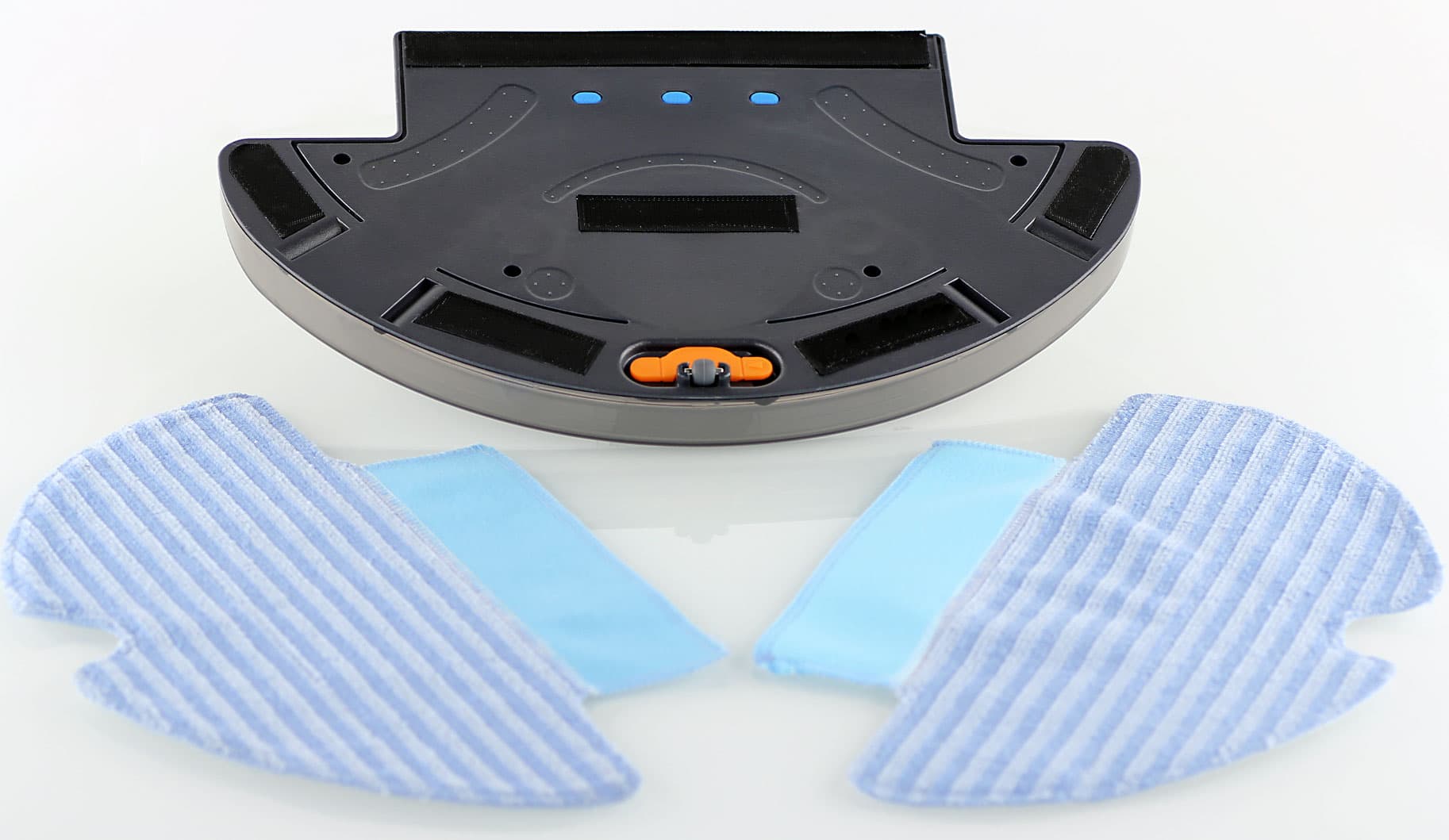 При уборке две передние щеточки подгребают мусор к центру, затем частички мусора через патрубок на днище потоком воздуха засасываются в пылесборник, где задерживаются сетчатым фильтром, а мельчайшие пылинки остаются на втором складчатом фильтре. Для дополнительной очистки гладких полов на днище робота можно закрепить специальную насадку, к которой на липучке прикрепляется махровая салфетка.
