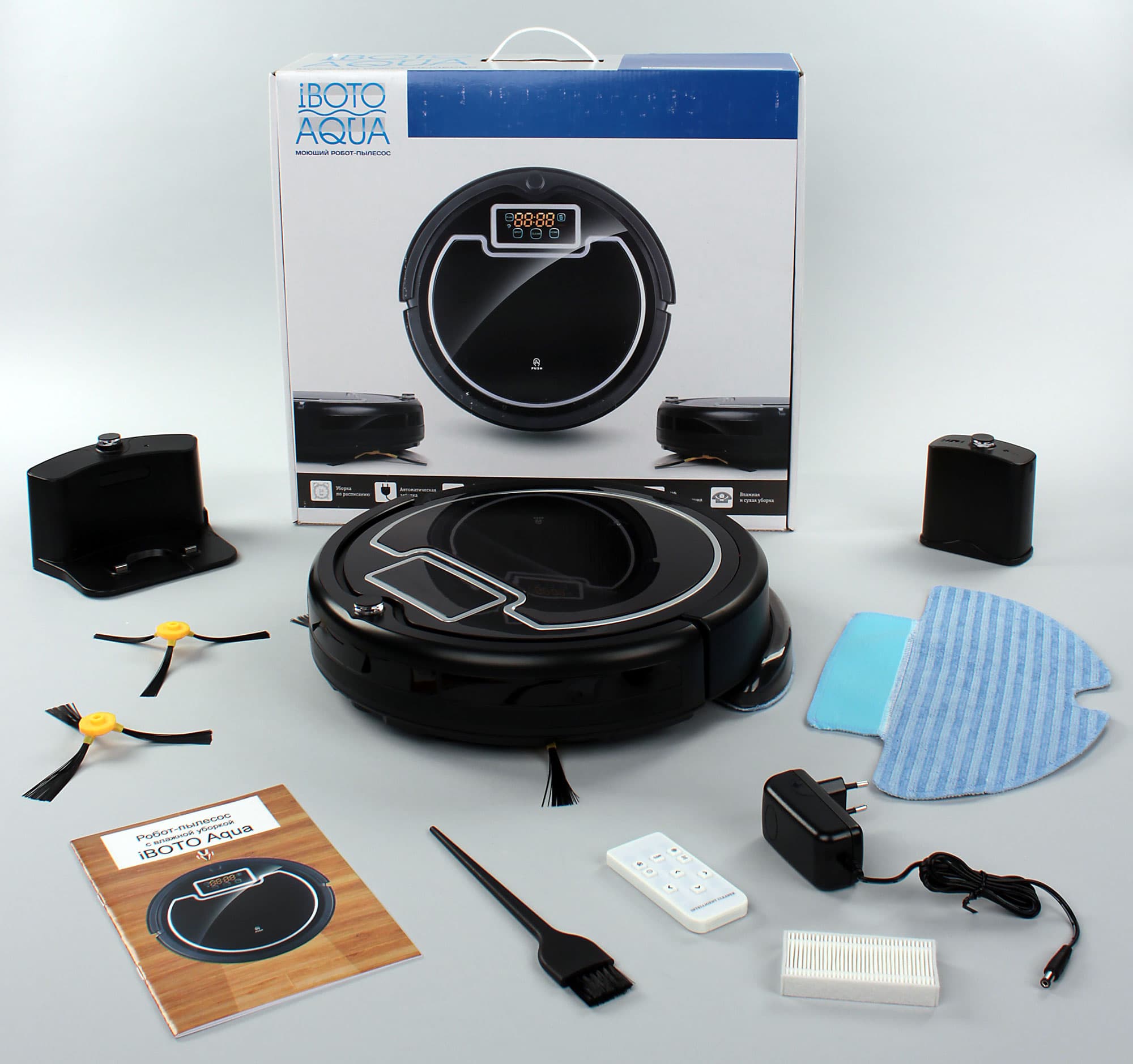 Робот-пылесос iBoto Aqua имеет хороший комплект поставки, в который входят дополнительные аксессуары, расширяющие функциональность робота, запасные боковые щеточки и расходные материалы. Робот умеет собирать мусор, выполнять влажную уборку и даже в какой-то степени дезинфицировать поверхность пола. iBoto Aqua сам возвращается на базу для зарядки аккумулятора и может быть запрограммирован на ежедневную уборку в заданное время. Стоит отметить удобную конструкцию пылесборника с верхней крышкой, который легко опустошать и который можно мыть под водой.