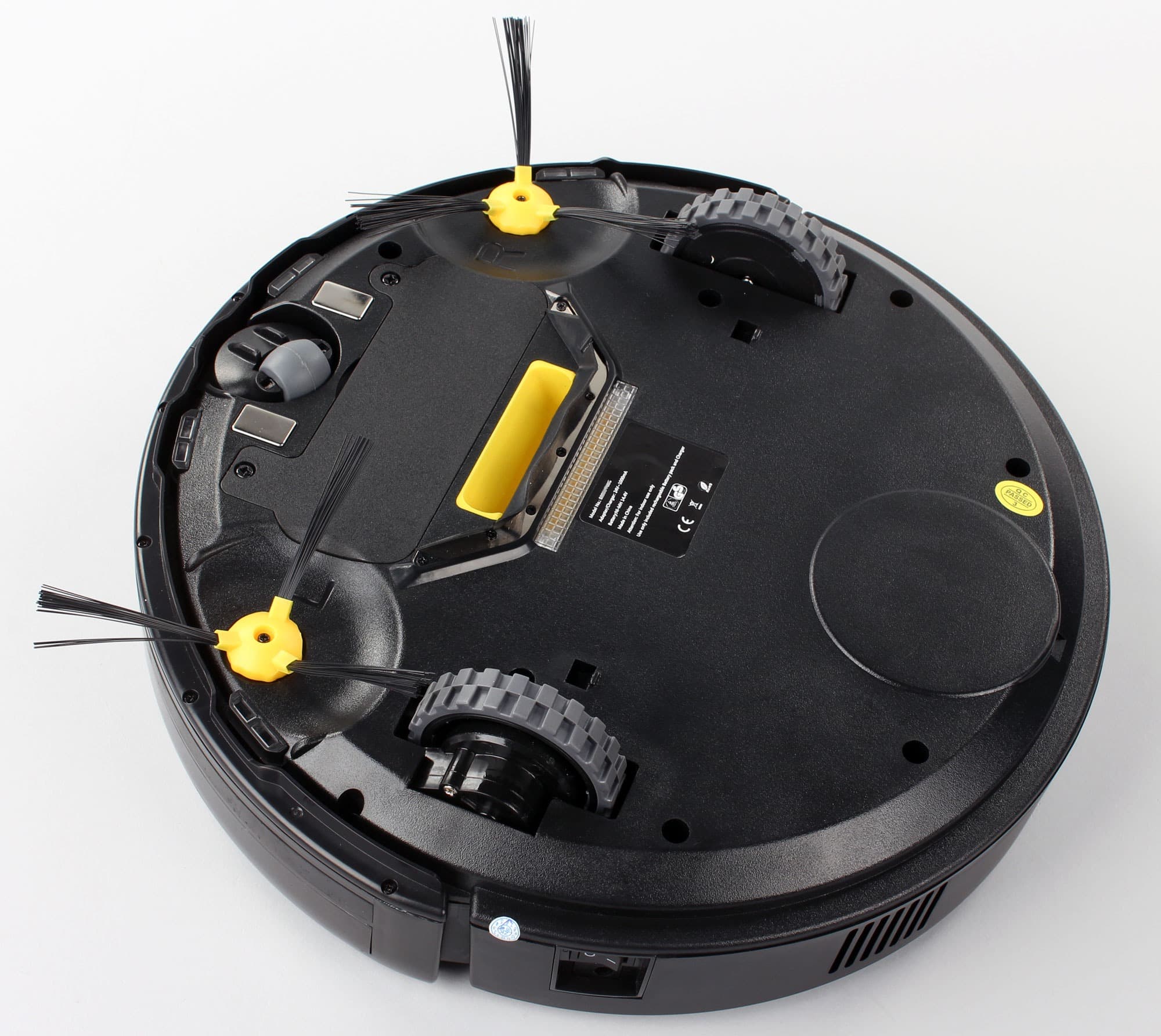 На днище находятся две контактные площадки, передний опорный поворотный ролик, две боковых щетки, крышка батарейного отсека, всасывающий патрубок с ИК-датчиком, обрамленный резиновой юбкой, рассеиватель ультрафиолетовой лампы и два ведущих колеса.