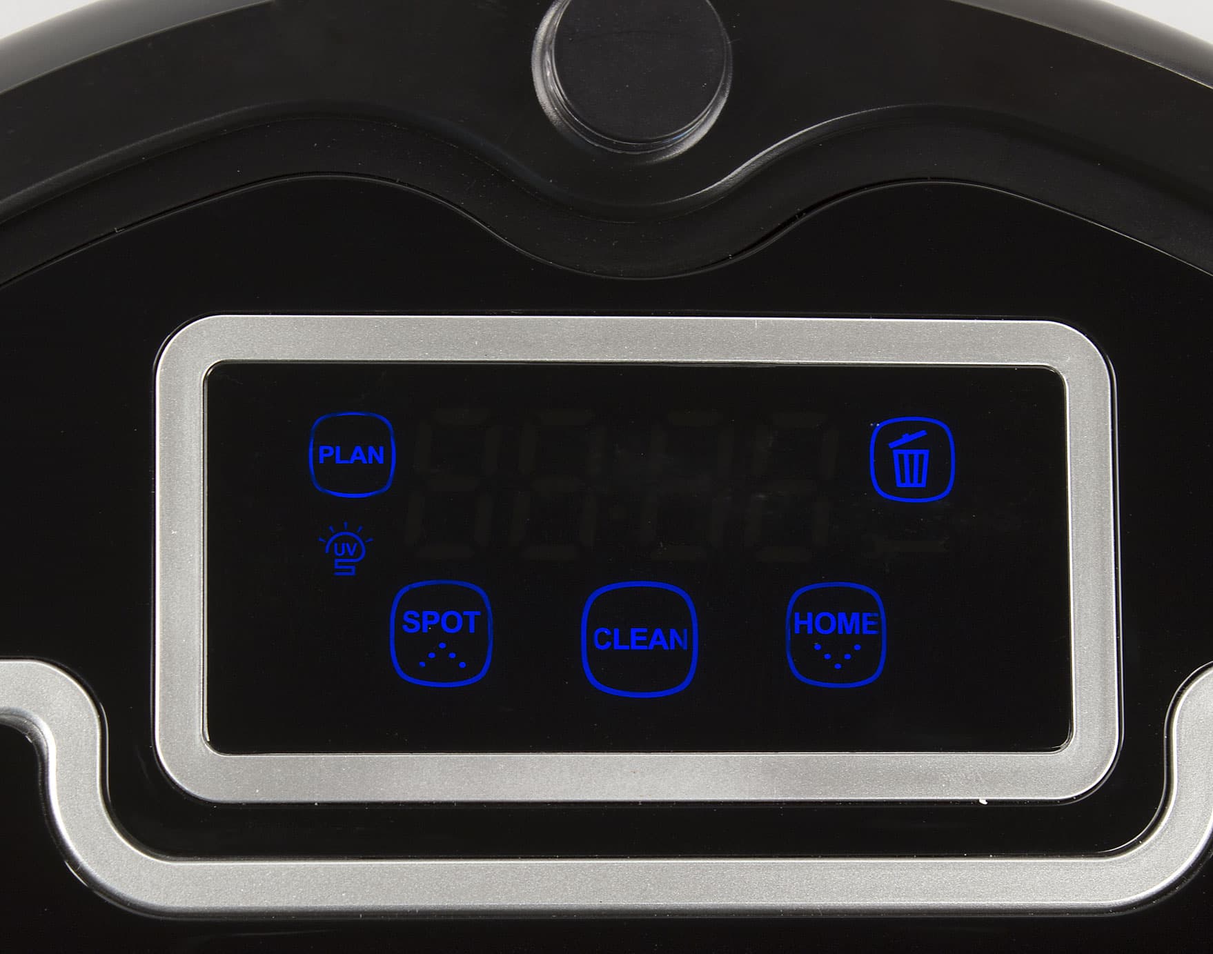 На верхней панели ближе к передней части корпуса находится контрольная панель с четырьмя ёмкостными сенсорными кнопками, подсвечиваемыми светодиодами значками режимов и состояния, а также сегментным светодиодным индикатором. Свечение значков и индикатора синее и неяркое, поэтому издалека и в светлом помещении рассмотреть что-либо на контрольной панели практически невозможно. Дополнительно о своем состоянии робот информирует с помощью звуковых сигналов и речевых сообщение на неразборчивом английском с выраженным китайским акцентом. Отключить звуковое оповещение нельзя. Нажав с усилием на значок с надписью PUSH (нажми), можно открыть крышку отсека пылесборника. Вынимается сам пылесборник за желтую ручку, а для его опустошения нужно отщелкнуть крышку, вынуть предварительный сетчатый фильтр и вытряхнуть собранный мусор из емкости.