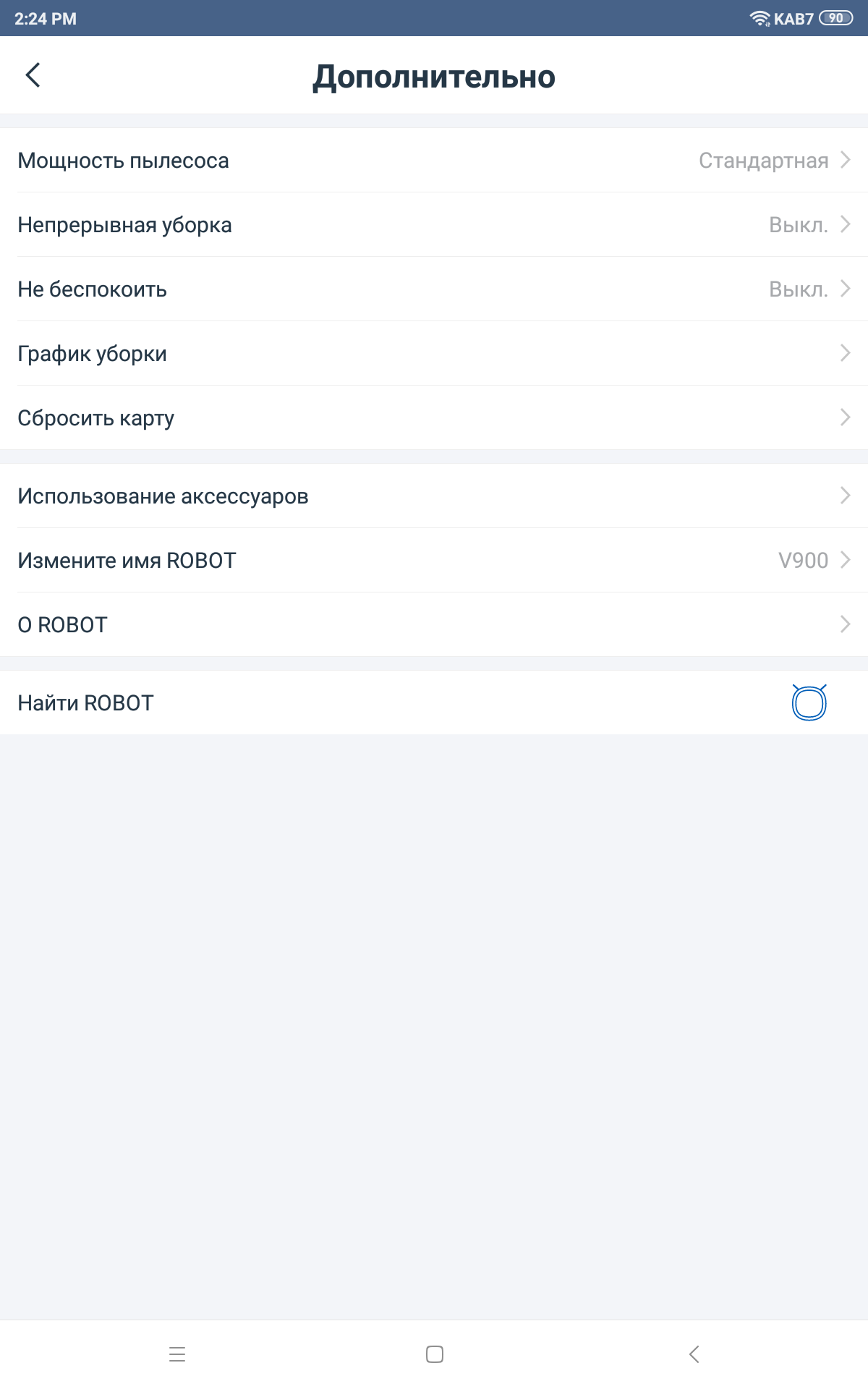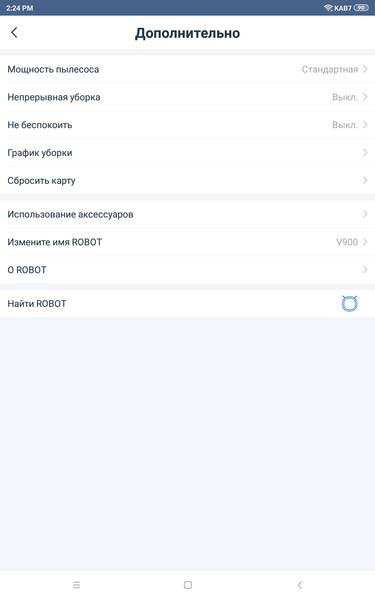 Фирменное приложение, устанавливаемое на мобильные устройства с Android (видимо, и iOS) на борту, расширяет функциональность робота. Запустив приложение первый раз, нужно установить связь с роботом, который должен быть в радиусе действия Wi-Fi-сети (поддерживается только 2,4 ГГц). Для управления роботом используется глобальный облачный сервис (необходима регистрация), поэтому доступ к роботу можно получить из любого места, где есть Сеть. С помощью приложения робот запускается на уборку, уборка приостанавливается, или робот по команде пользователя отправляется на базу. В приложении можно управлять мощностью вентилятора (три ступени), включать/выключать режим продолжения уборки после подзарядки, настраивать период режима Не беспокоить, задавать расписание уборки, отслеживать ресурс щеток и фильтра, а функция Найти Robot поможет это сделать — робот скажет фразу: «Привет! Я здесь!».