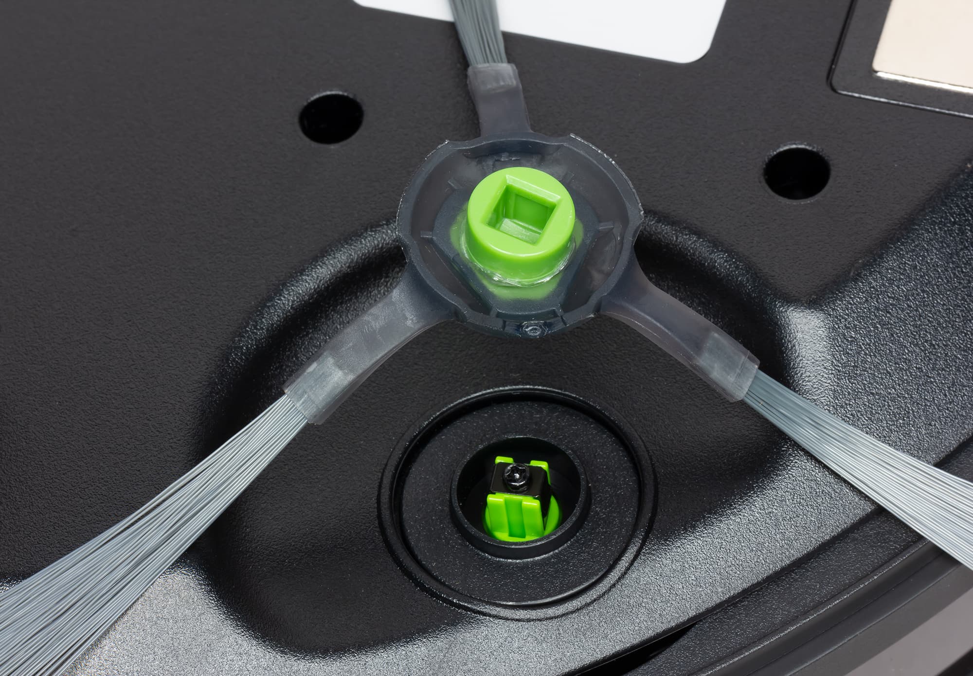 Боковые щеточки имеют длинную пластиковую щетину средней жесткости, пучки которой выходят из упругих поводков. Как показала практика, эта щетина хорошо сохраняет форму. Правая и левая щеточки отличаются поворотом поводков, а чтобы пользователь знал, какую куда устанавливать, применяется цветовая дифференциация: щеточка с зеленой втулкой закрепляется на зеленый вал, а с красной — на красный. К осям приводов щеточки крепятся с помощью пружинного фиксатора, что очень удобно.