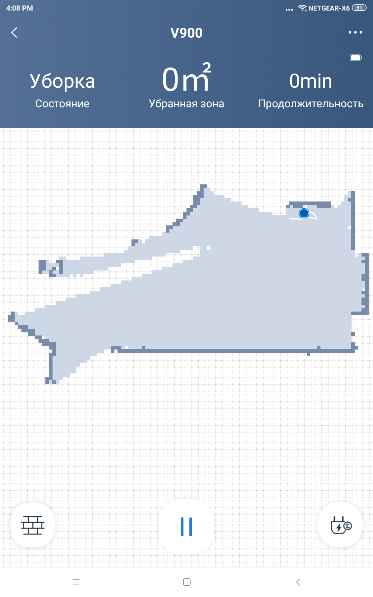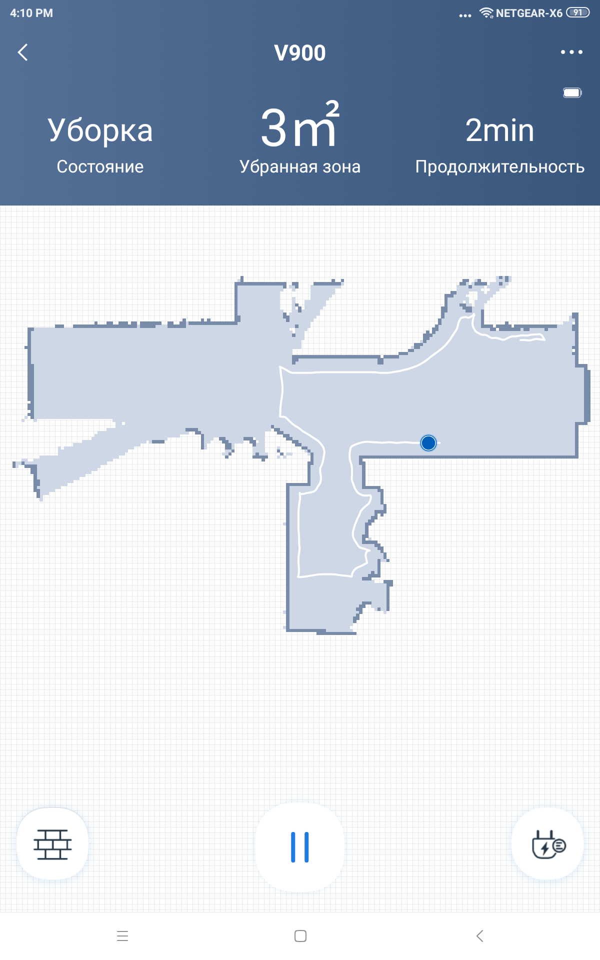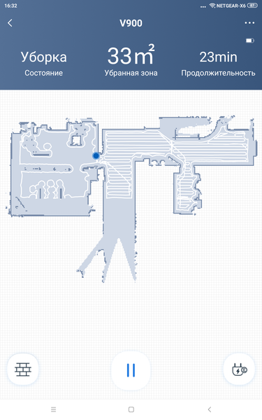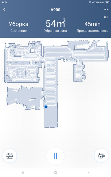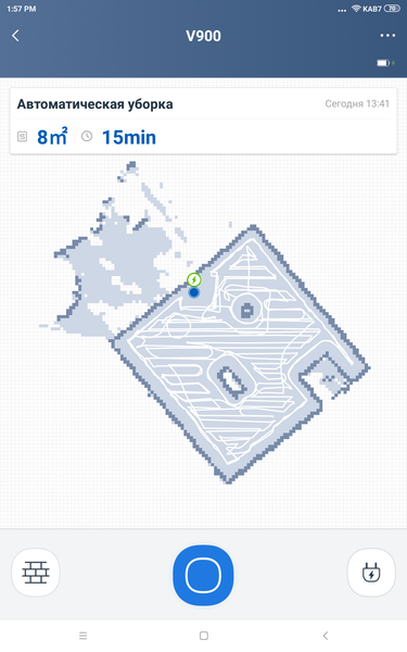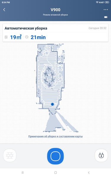 В режиме влажной уборки робот убирал помещение площадью 30 м² (мебели относительно много) с линолеумом на полу в течение 22 минут, после чего вернулся в то место, откуда его запустили. Построенная карта убранной площади (дверь внизу на карте иногда открывалась):