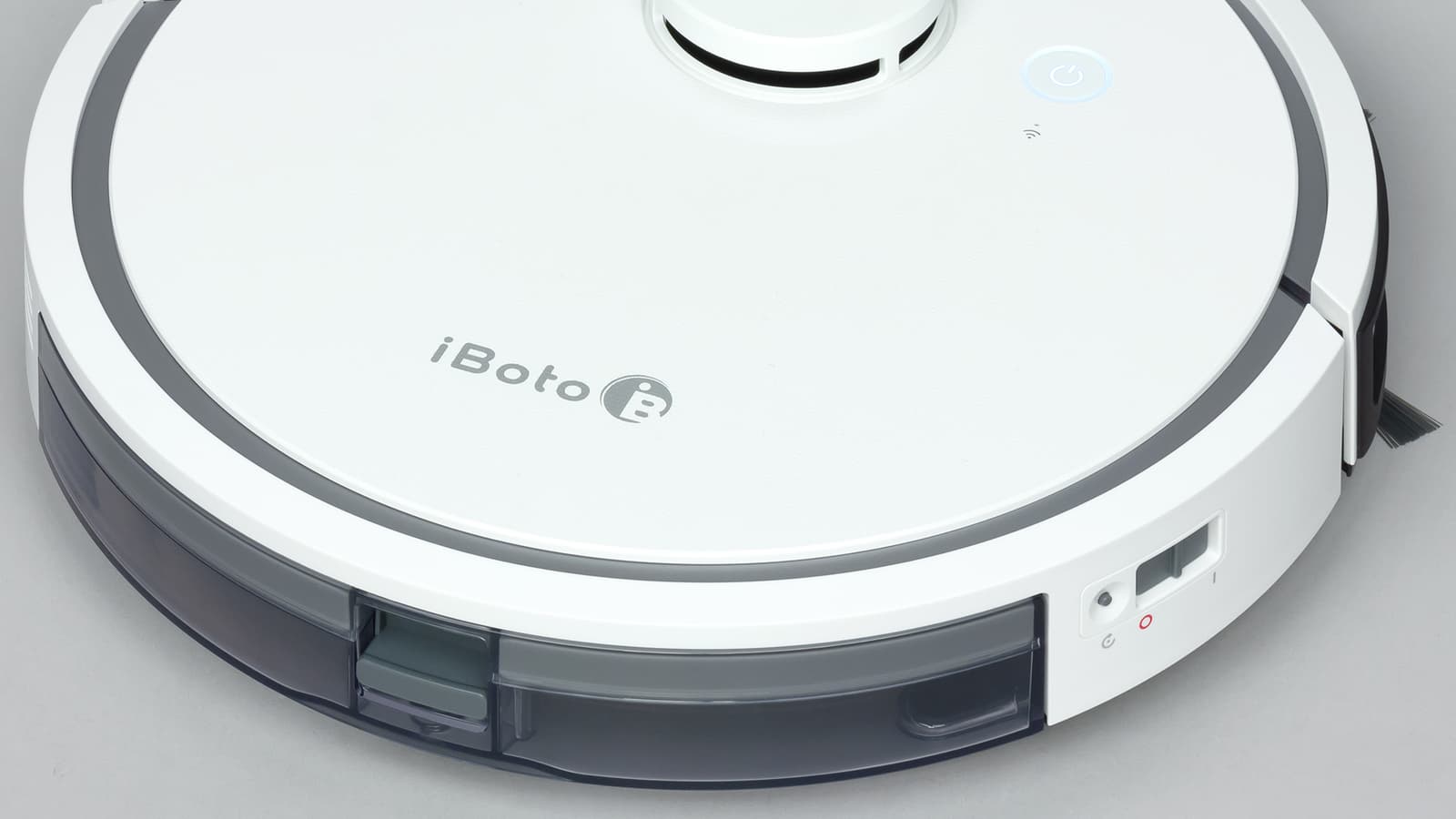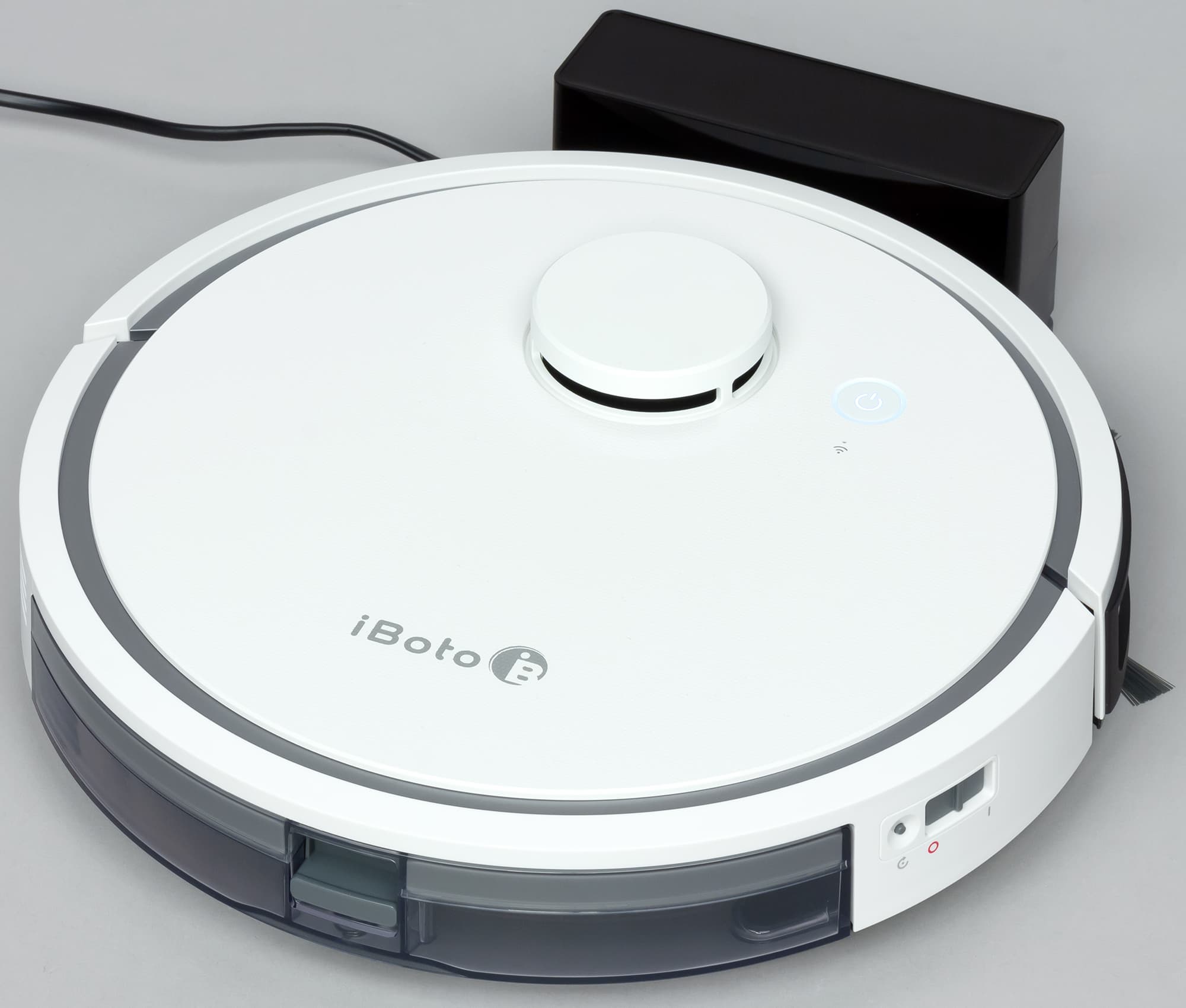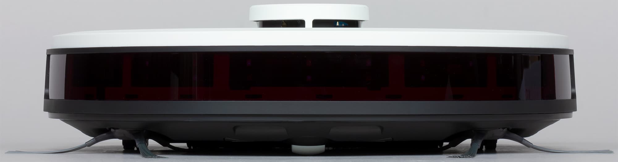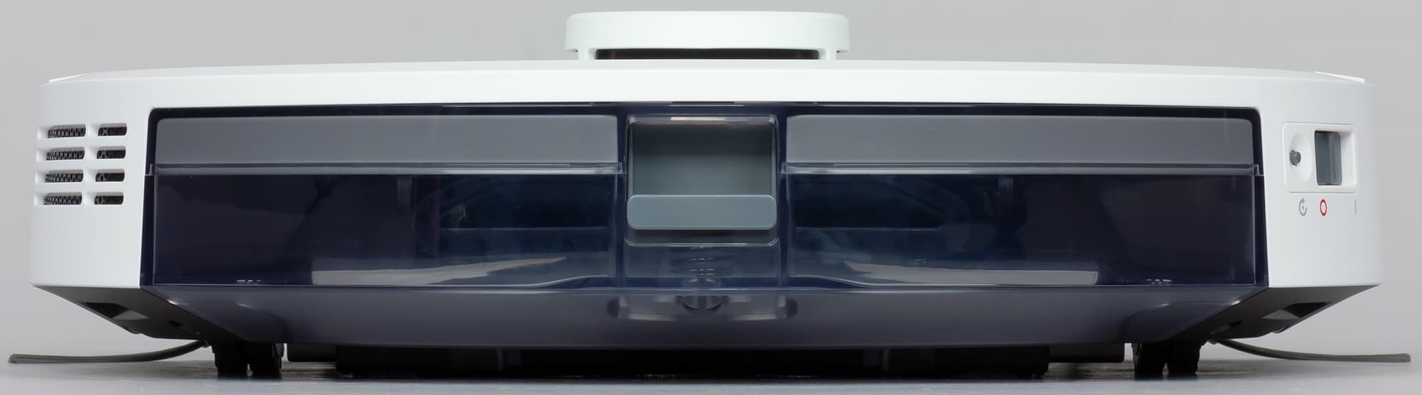 Края сзади снизу скошены, что помогает роботу преодолевать препятствия, а выраженный бортик сверху снижает вероятность того, что пылесос будет застревать под мебелью с небольшим просветом от пола. На правом боку расположены сдвижной переключатель питания, отключающий батарею от основных цепей робота, и кнопка сброса настроек подключения к Сети.