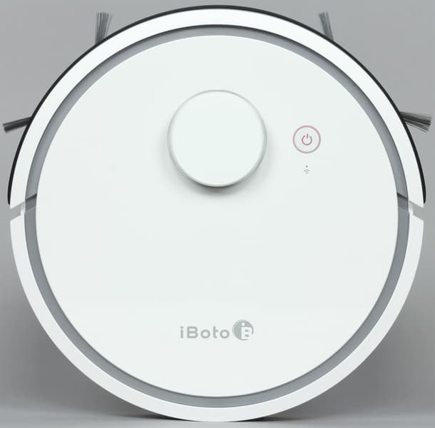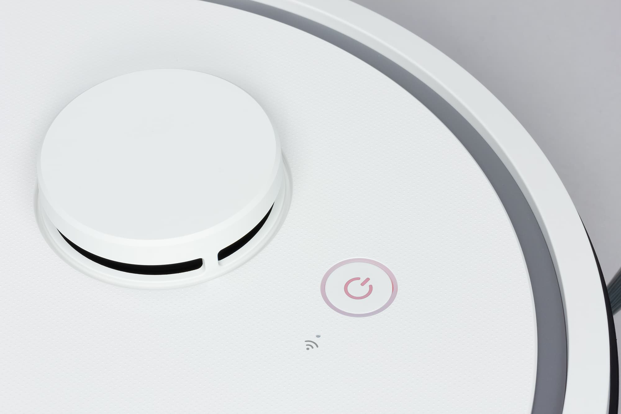 На верхней панели справа от башенки лидара находится механическая кнопка. Короткое нажатие на эту кнопку запускает или останавливает уборку, а длительное удерживание — заставляет робота вернуться на базу. Значок питания на кнопке и ободок вокруг нее подсвечиваются красным или белым, горят ровно или мигают в зависимости от состояния робота. Небольшой белый светодиодный индикатор, расположенный рядом со значком Wi-Fi, помогает понять текущее состояние подключения к сети.