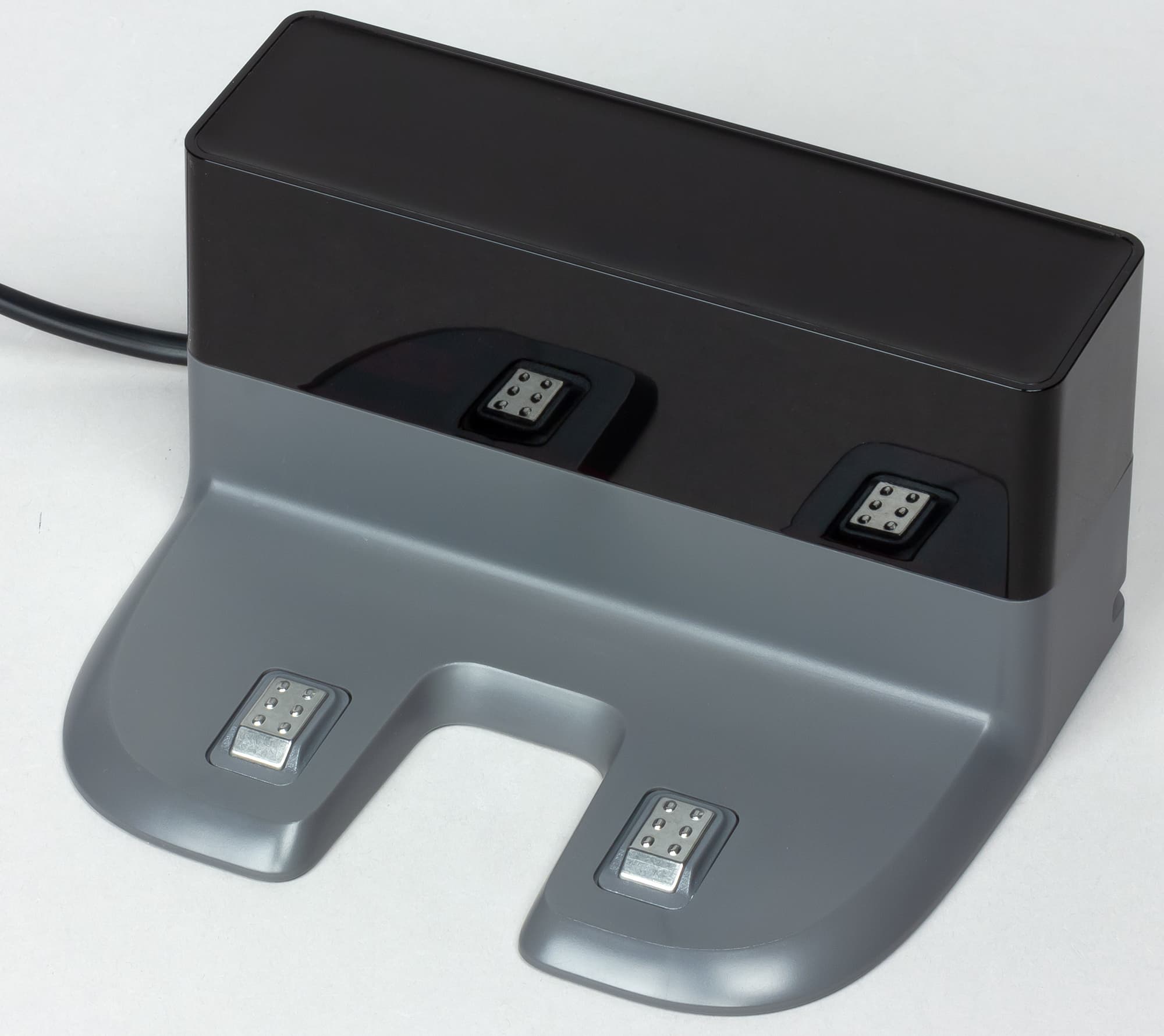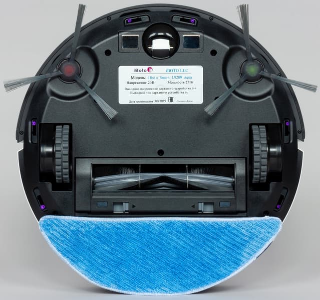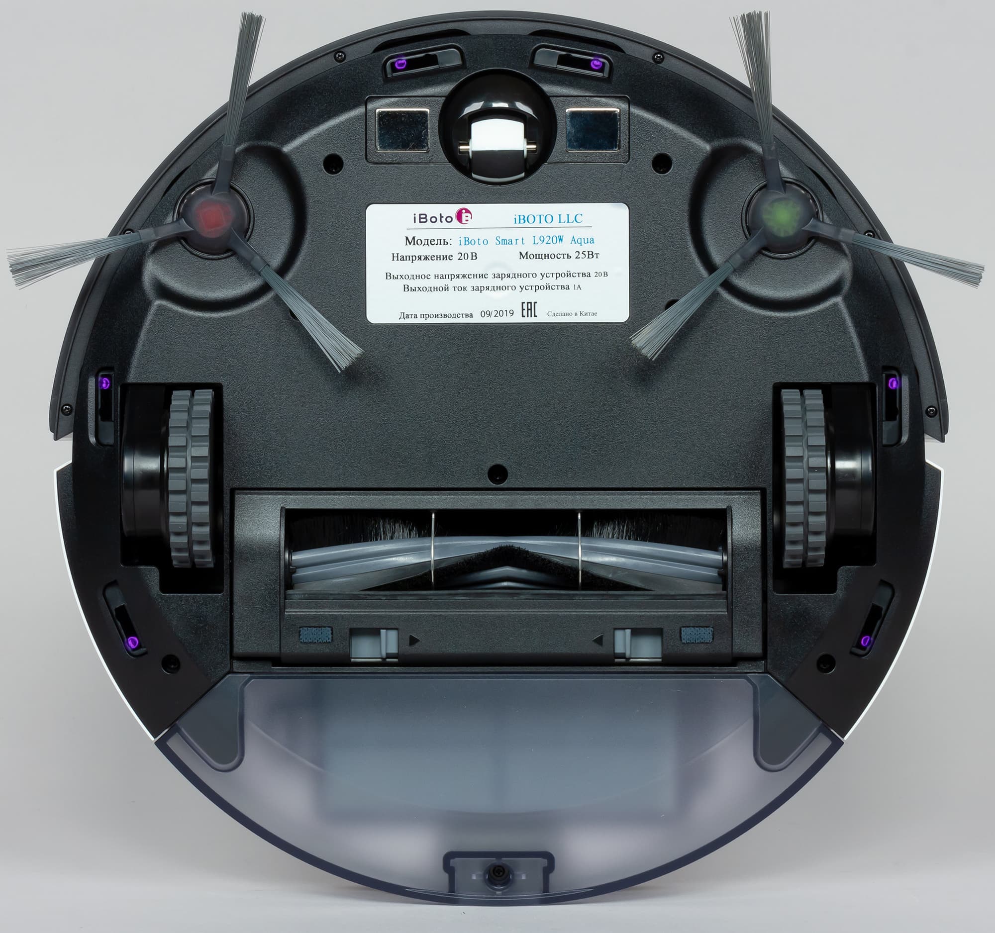 На днище расположены две контактные площадки, передний опорный поворотный ролик, боковые щеточки, два ведущих колеса, отсек основной щетки. Чтобы добраться до батарейного отсека, нужно снять нижнюю панель целиком. Ближе к краю находятся шесть ИК-датчиков перепада высоты, благодаря которым робот-пылесос может избежать падения со ступенек.