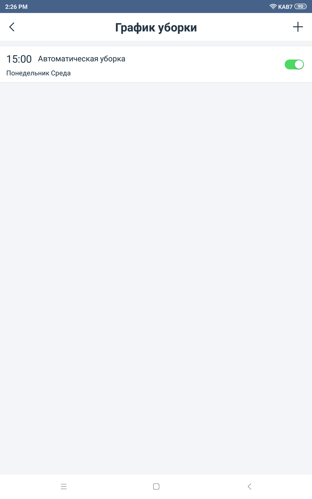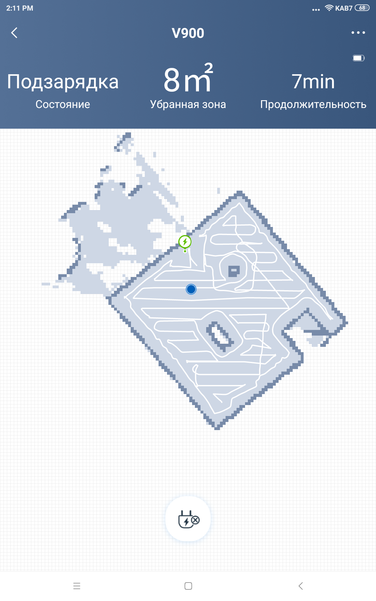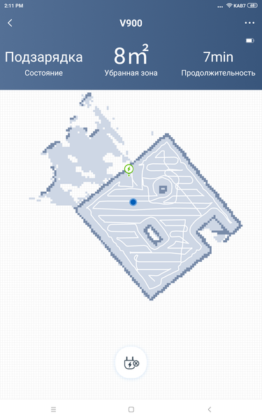 В этом режиме робот будет убирать или пока не уберет всю доступную площадь, или до снижения заряда батареи до критического уровня. В обоих случаях при запуске с базы робот возвращается на базу для зарядки аккумулятора. В приложении можно включить режим продолжения уборки после дозарядки, если робот не успел убрать везде.