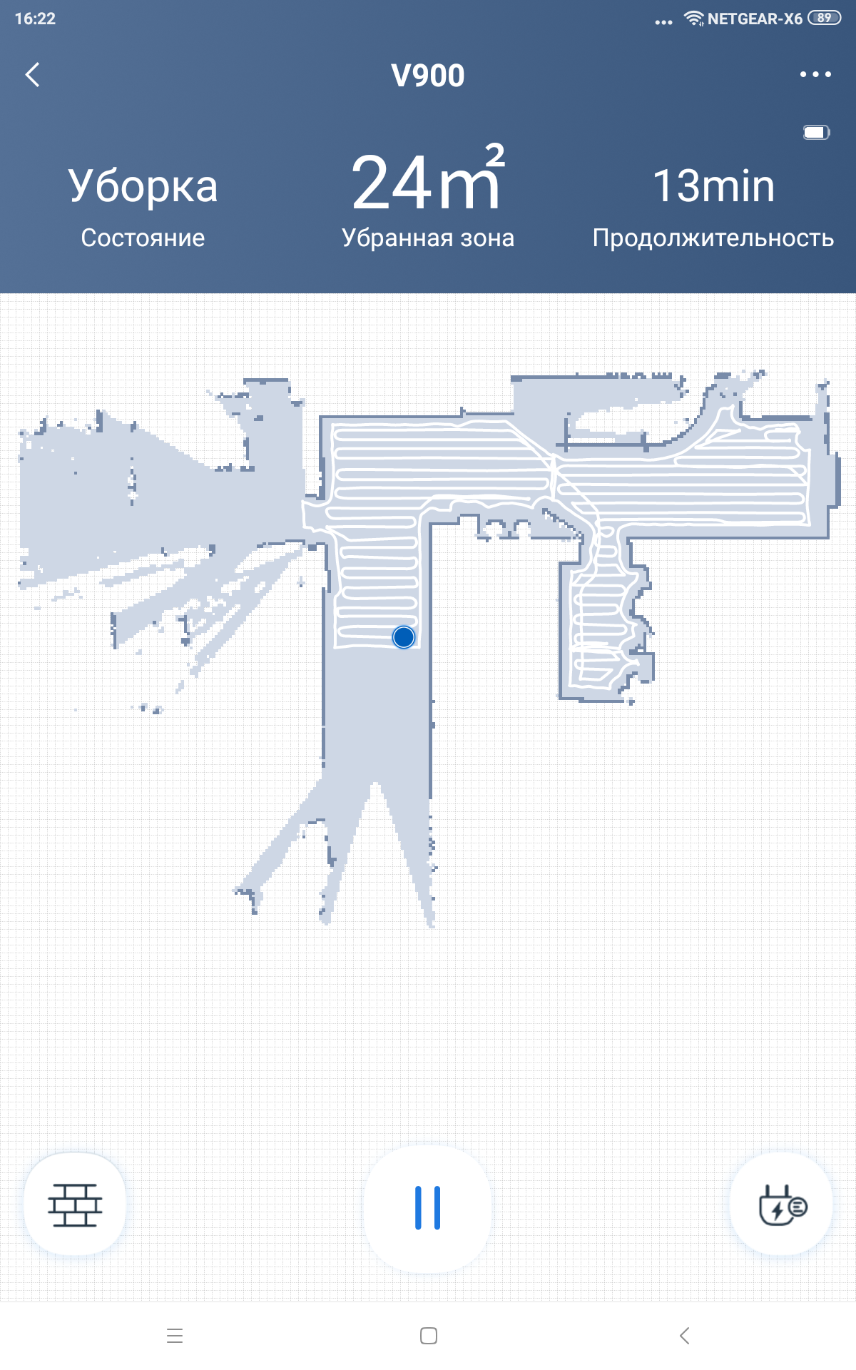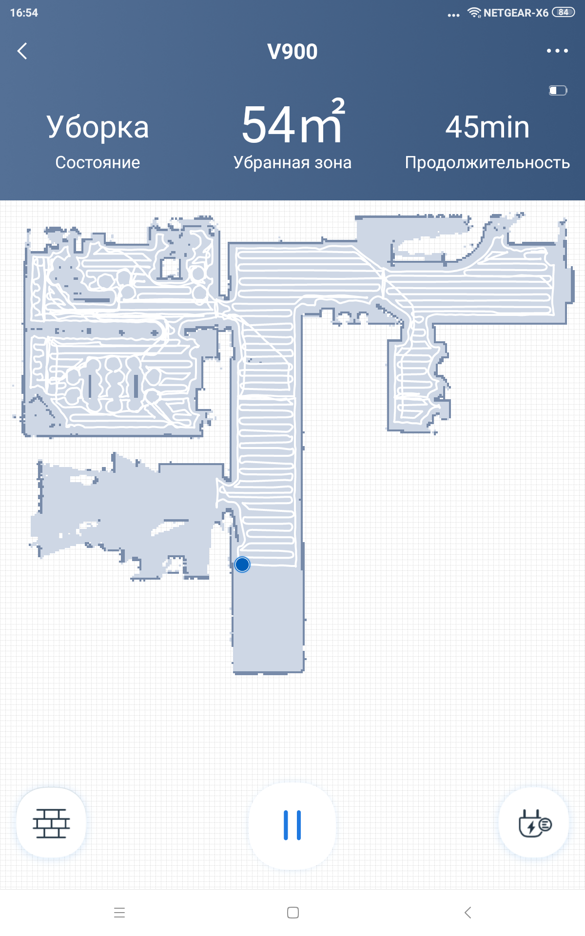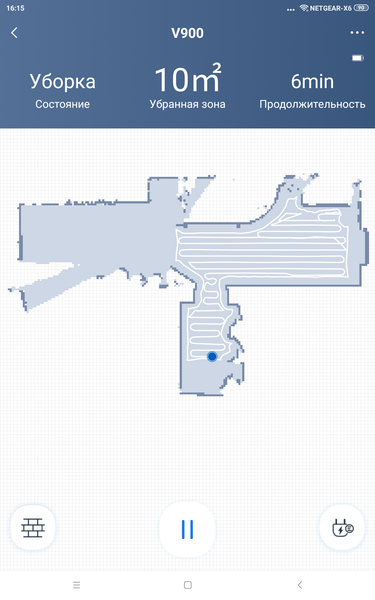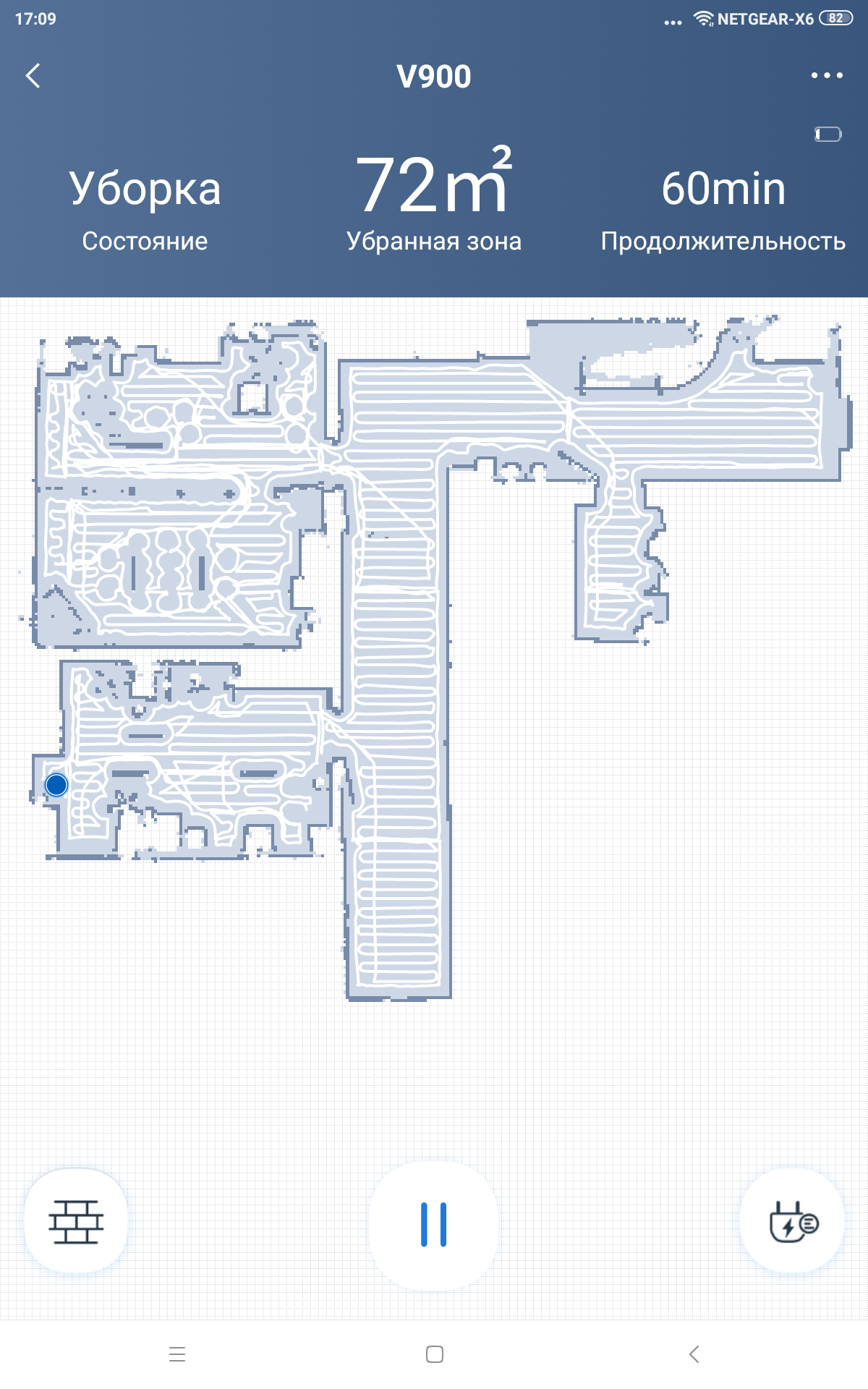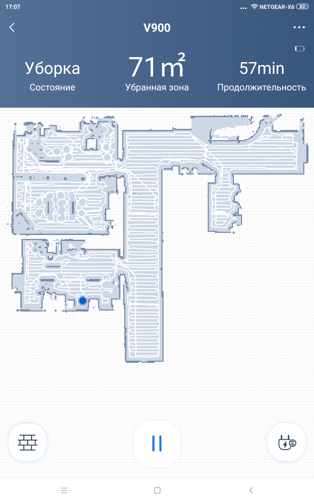 Робот работал на максимальной мощности всасывания в течение 63 минут до критического снижения уровня заряда батареи. После чего быстро и практически кратчайшим путем вернулся на базу. Так совпало, что именно этого времени роботу хватило, чтобы везде тщательно убрать. То есть на одном заряде и в режиме максимальной мощности робот может убрать площадь порядка 94 м², с учетом пространства занятого мебелью. Сам робот сообщил о 72 м² убранной площади. Разумеется, чем свободней будет площадь, тем больше робот уберет на одном заряде, так как будет тратить меньше времени на объезд препятствий. Убирая большое помещение, робот делит его на участки, не учитывая фактическое деление на комнаты, обходит их по периметру, затем внутри змейкой, потом вычищает пропущенные места, после чего переходит к следующему участку. Серия снимков экрана с картой поясняет этот процесс: