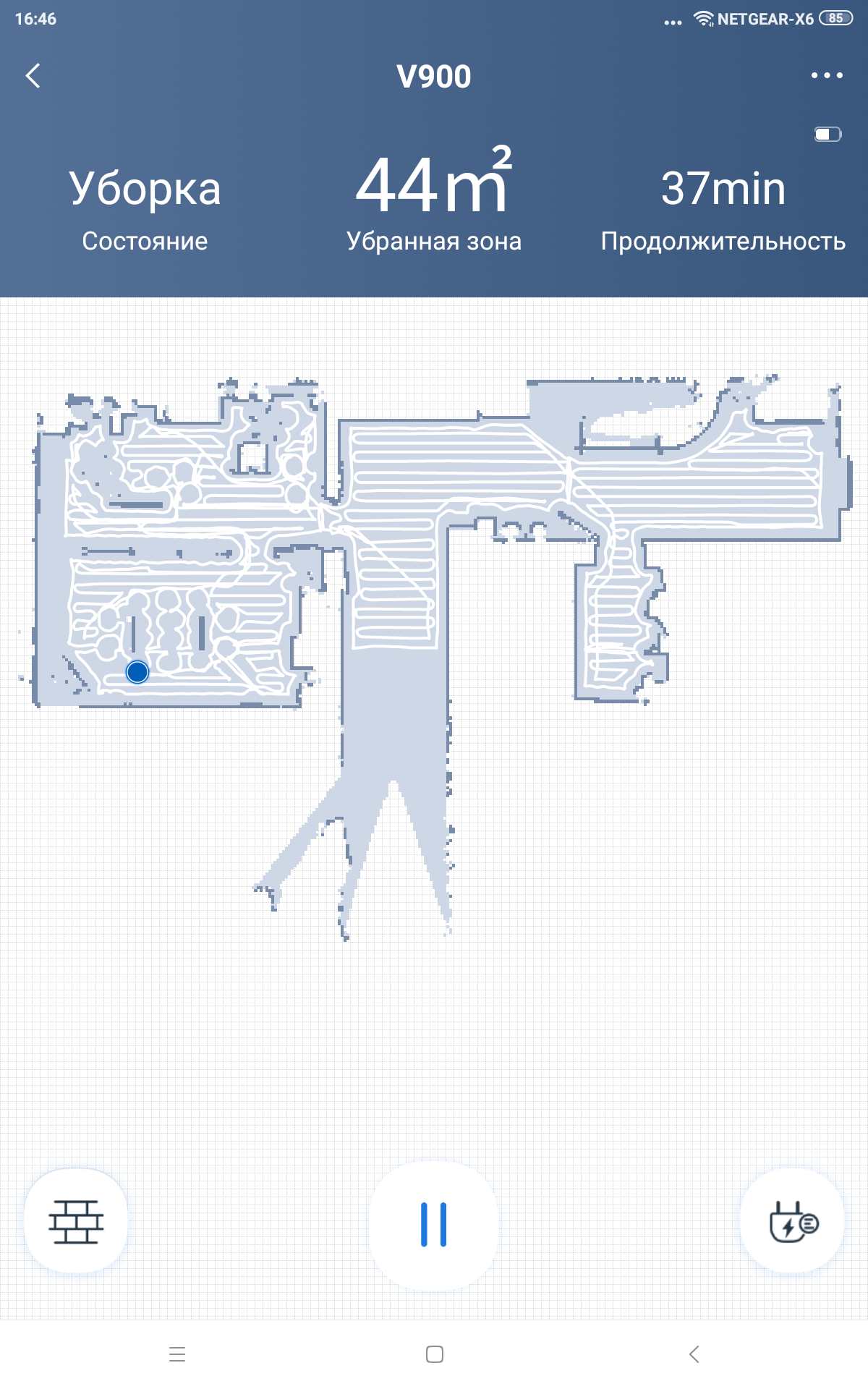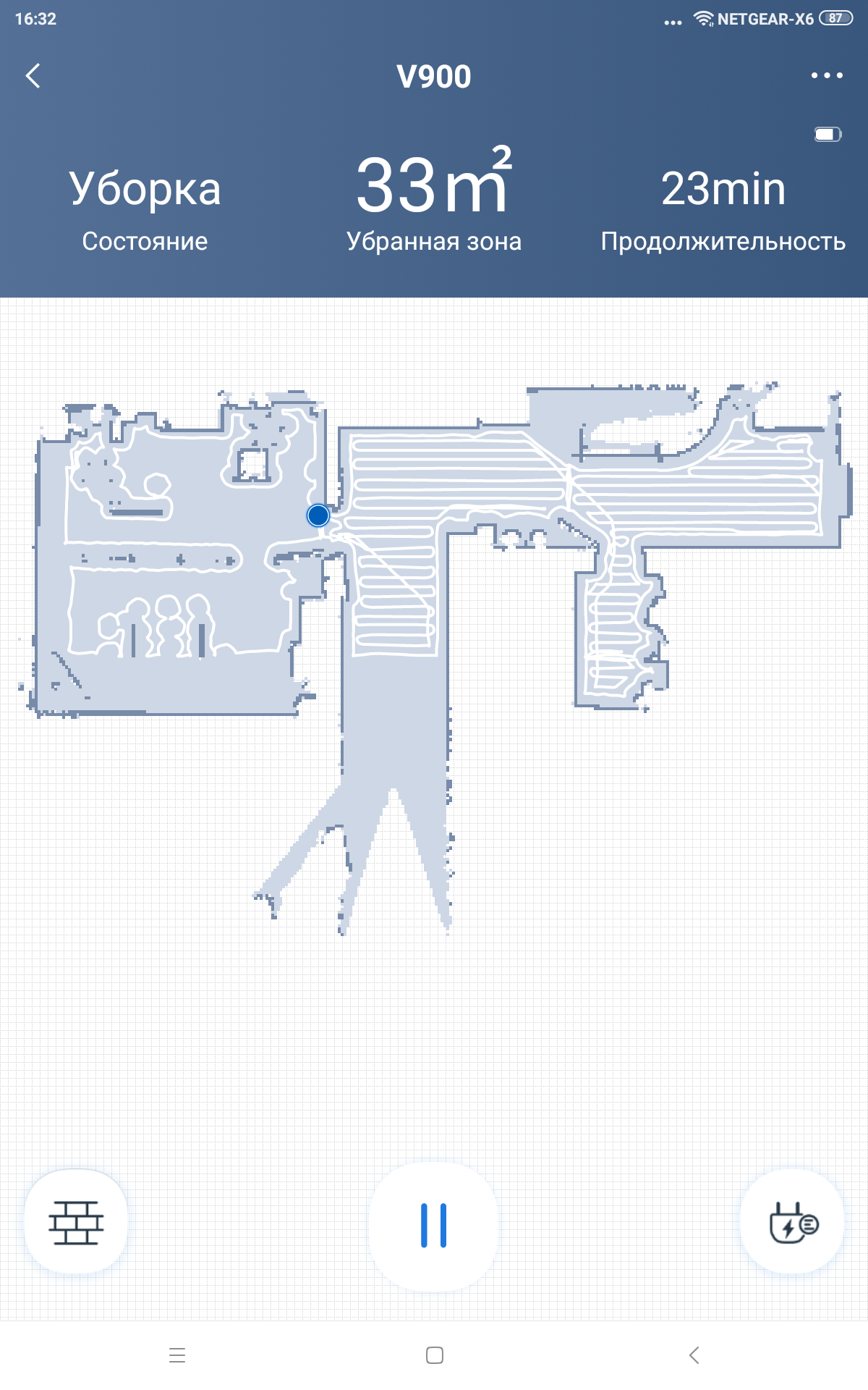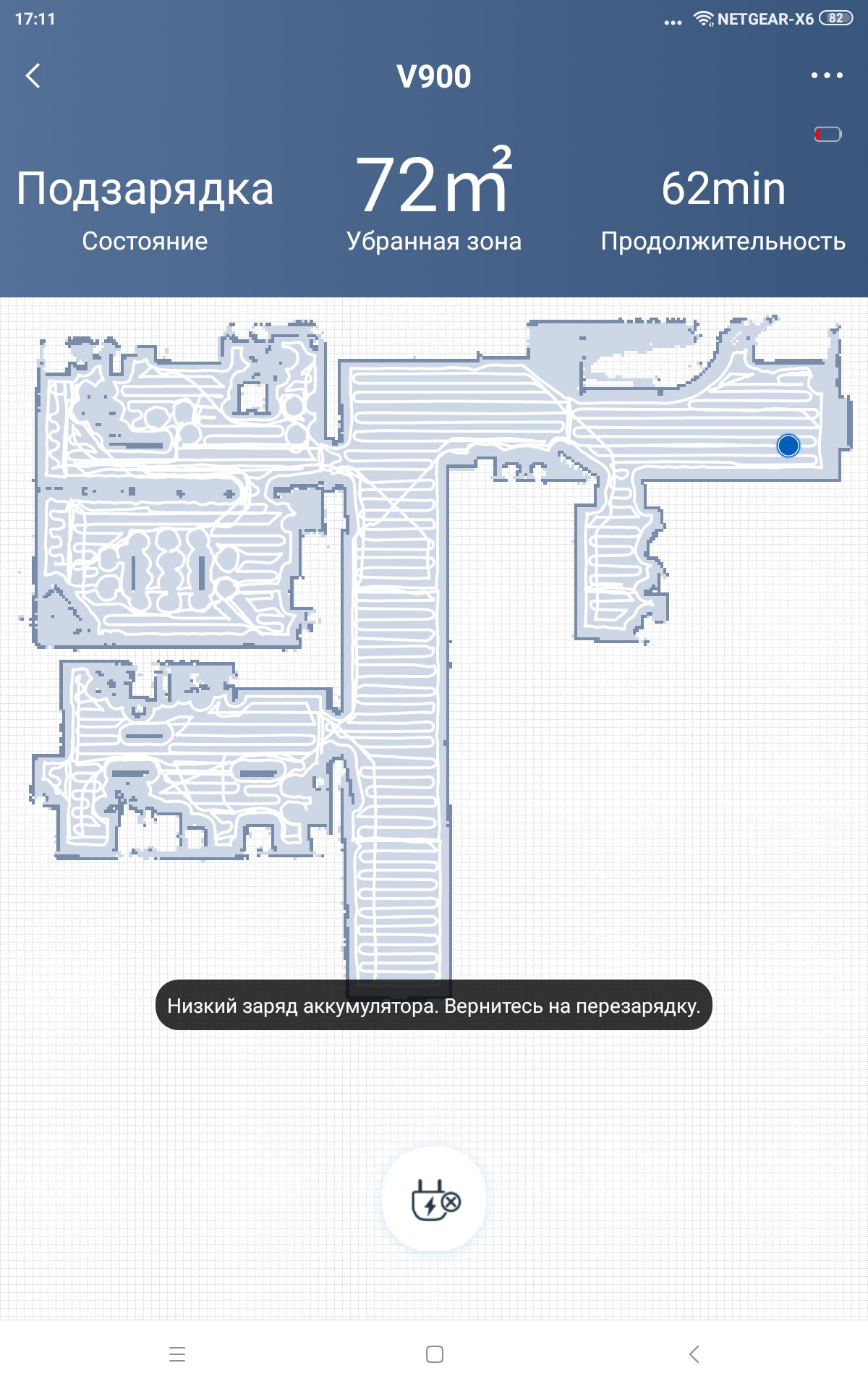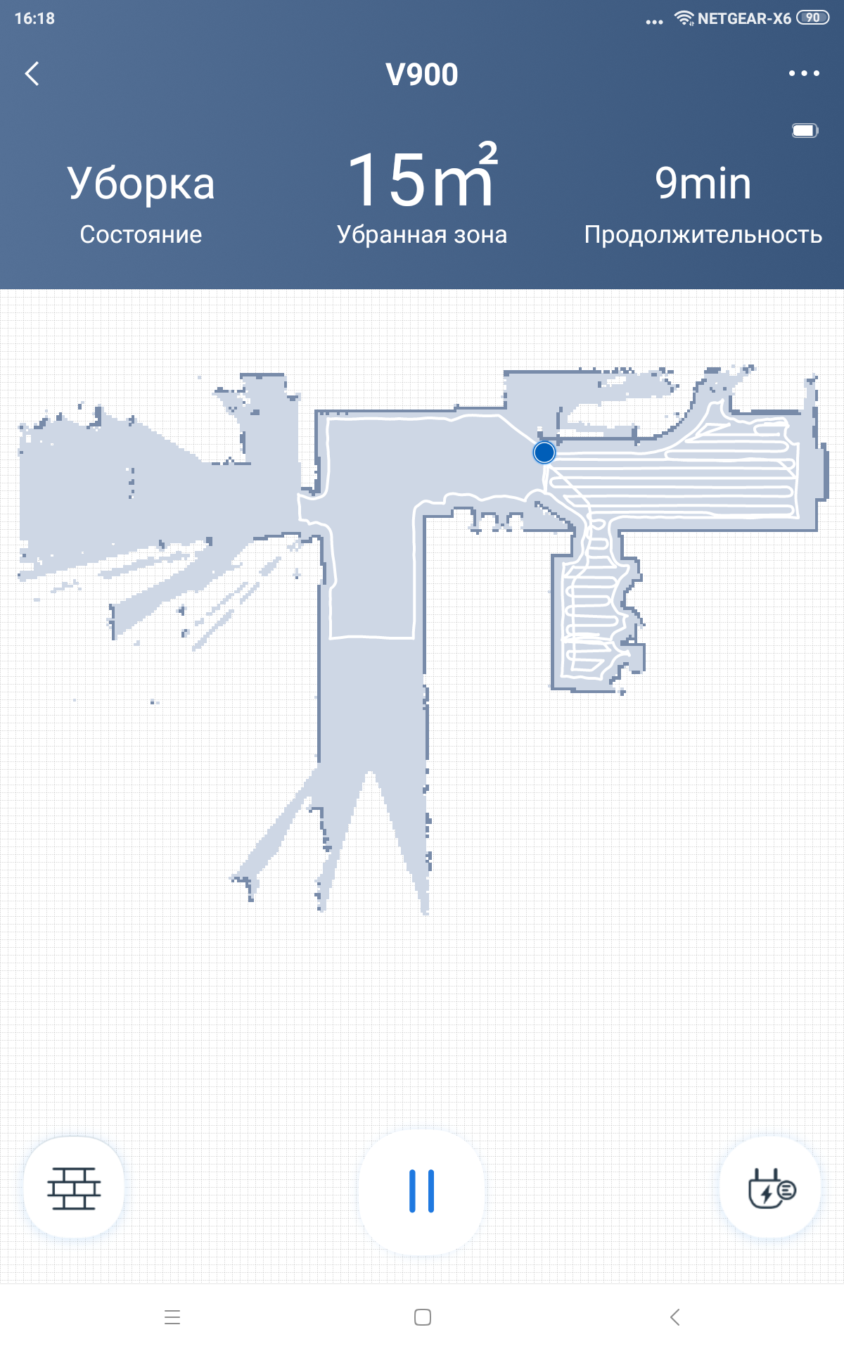 Робот работал на максимальной мощности всасывания в течение 63 минут до критического снижения уровня заряда батареи. После чего быстро и практически кратчайшим путем вернулся на базу. Так совпало, что именно этого времени роботу хватило, чтобы везде тщательно убрать. То есть на одном заряде и в режиме максимальной мощности робот может убрать площадь порядка 94 м², с учетом пространства занятого мебелью. Сам робот сообщил о 72 м² убранной площади. Разумеется, чем свободней будет площадь, тем больше робот уберет на одном заряде, так как будет тратить меньше времени на объезд препятствий. Убирая большое помещение, робот делит его на участки, не учитывая фактическое деление на комнаты, обходит их по периметру, затем внутри змейкой, потом вычищает пропущенные места, после чего переходит к следующему участку. Серия снимков экрана с картой поясняет этот процесс: