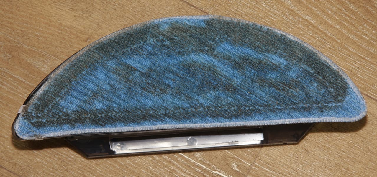 Салфетку можно предварительно увлажнить, а для поддержания ее во влажном состоянии, в бак нужно залить воду. Экспериментально определенный объем емкости для воды равен 330 мл. В горловине, которую закрывает силиконовая пробка, есть сетчатый фильтр. Жидкость на салфетку просачивается через отверстия в днище бака. Электрический клапан, установленный в блоке для влажной уборки, дозирует поступление воздуха в объем бака, что в свою очередь контролирует скорость вытекания воды. В процессе уборки нужно следить за уровнем воды, чтобы при необходимости долить воду в бак. В режиме влажной уборки основная и боковые щеточки вращаются, поэтому немного мусора забрасывается в крохотный отсек в передней части блока для влажной уборки. Перед зарядкой робота блок для влажной уборки нужно снять.