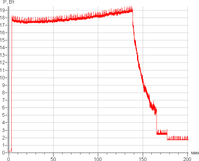 Заряжается робот довольно быстро — на восстановление заряда роботу требуется провести на базе примерно 3 часа. График потребления от сети при прямой зарядке от адаптера (примерно на отметке 3 мин. зарядка началась и на отметке 177 мин. робот зарядился):