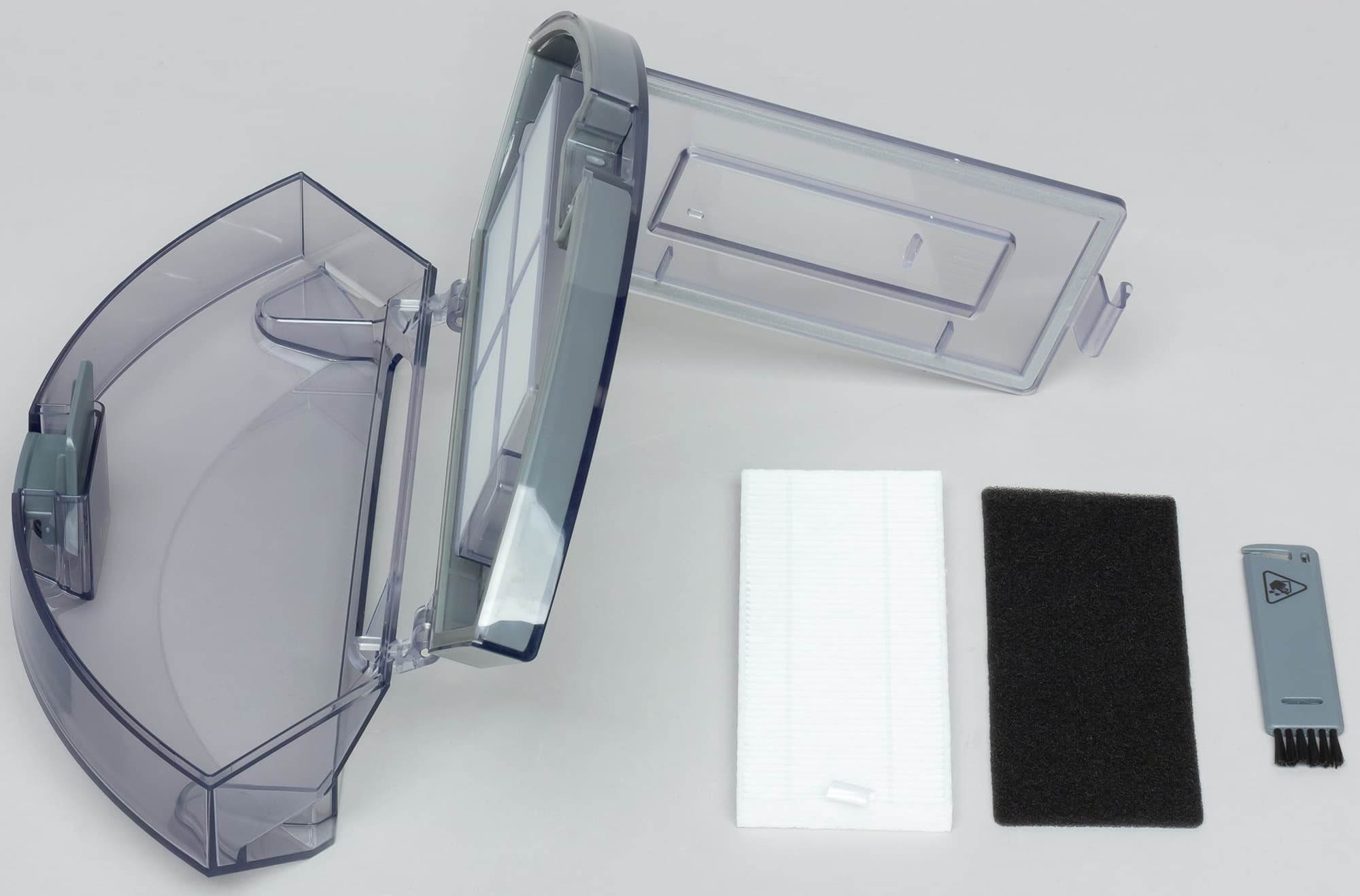 Нажав на фиксатор сзади, можно отсоединить пылесборник от корпуса робота. Корпус пылесборника выполнен из слегка тонированного прозрачного пластика, поэтому степень его заполнения можно попытаться оценить, рассмотрев содержимое через заднюю стенку. Верхняя часть пылесборника откидывается на большой угол, что позволяет без труда вытряхнуть скопившийся мусор. Для полной очистки нужно открыть крышку отсека фильтров, вынуть поролоновый и складчатый фильтр тонкой очистки. Предварительный сетчатый фильтр вклеен в дно отсека фильтров и не снимается.
