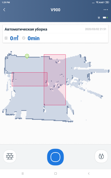 Карту робот строит во время уборки. При запуске в том помещении, в котором робот уже выполнил цикл уборки и для которого сохранилась карта, робот может ее загрузить, не строя заново. Сколько всего карт сохраняется непонятно, но точно несколько. На карте можно задать прямоугольные области (красные полупрозрачные на снимке выше), которые нужно избегать во время уборки. Сколько всего может быть таких областей мы не выяснили, но точно больше 20. Эти области сохраняются вместе с картой.