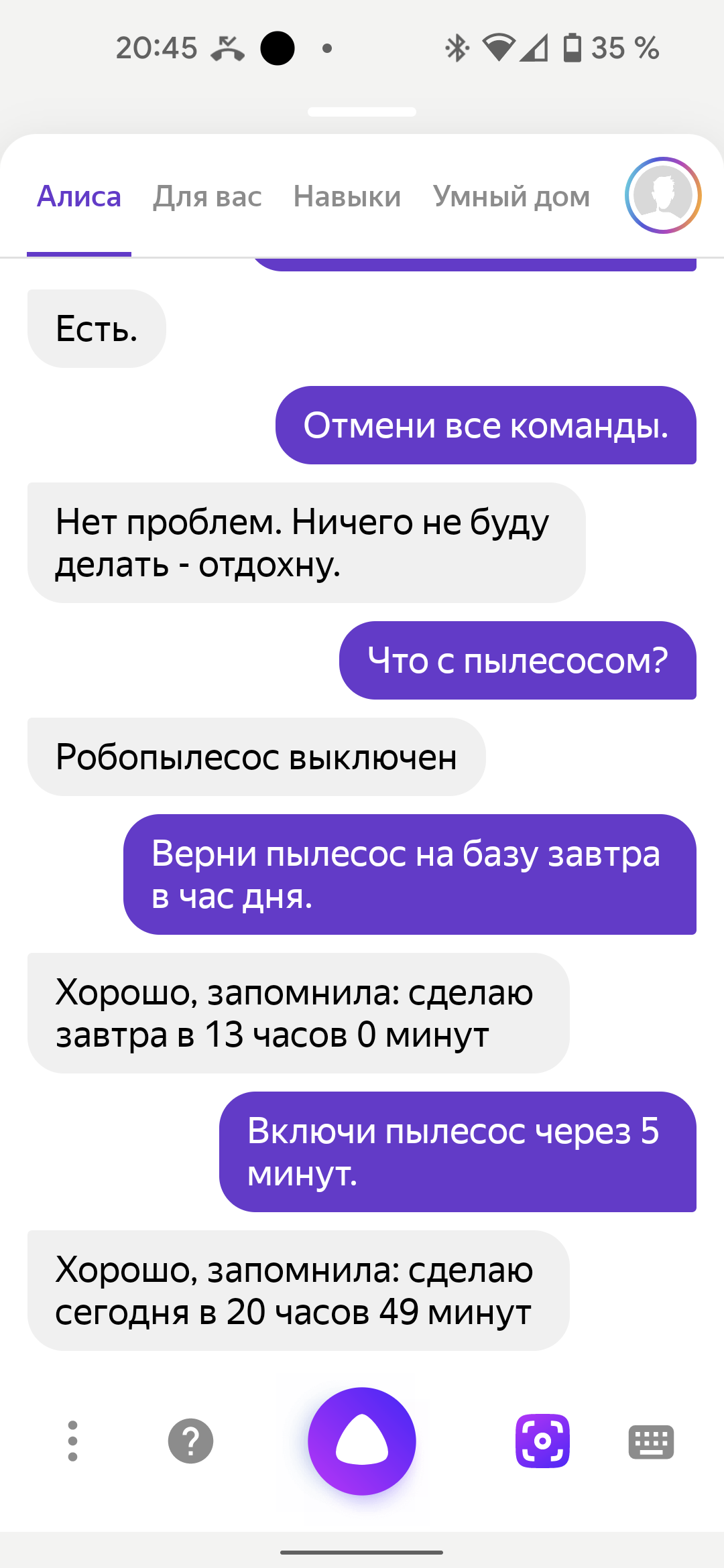 С помощью устных команд мы можем включить и выключить автоматическую уборку, узнать о статусе пылесоса, а также запланировать работу по расписанию.