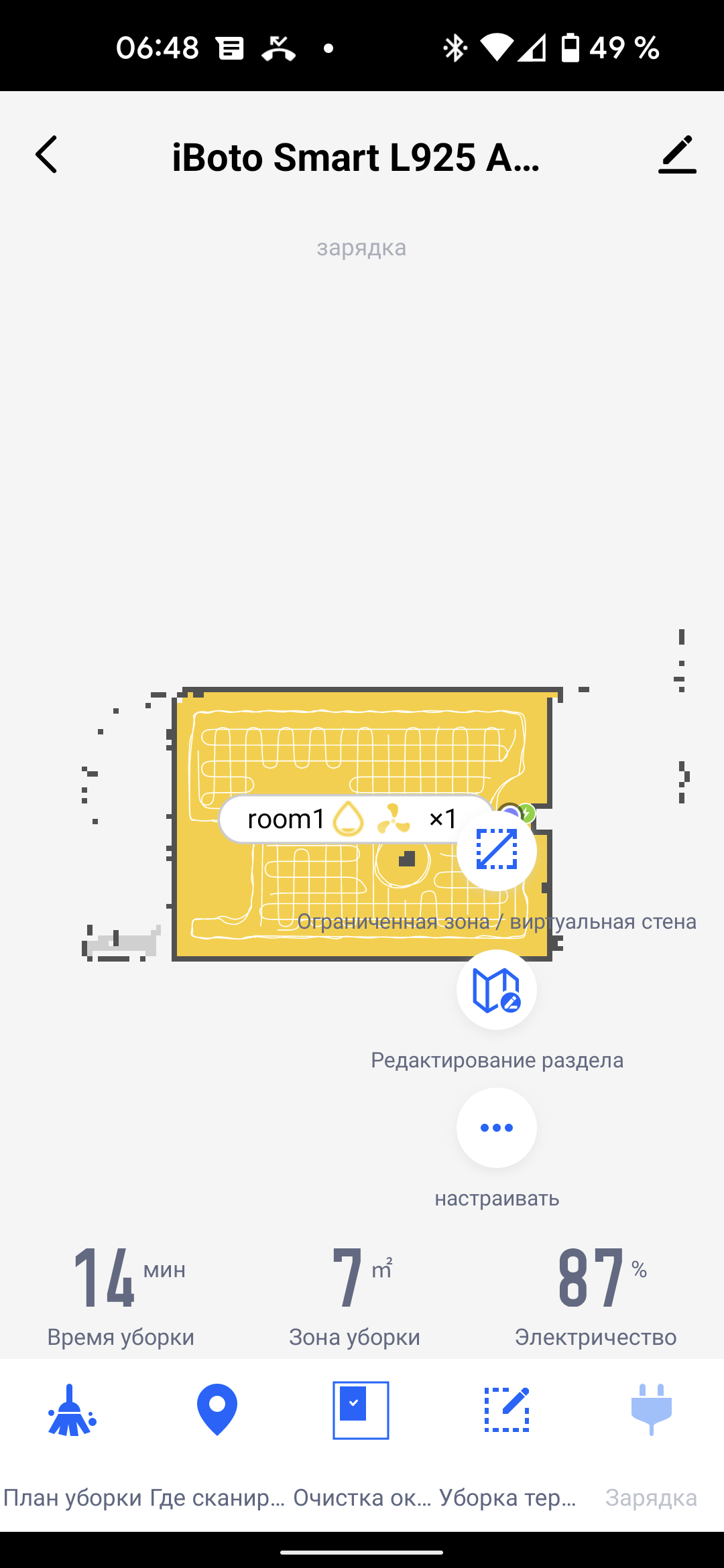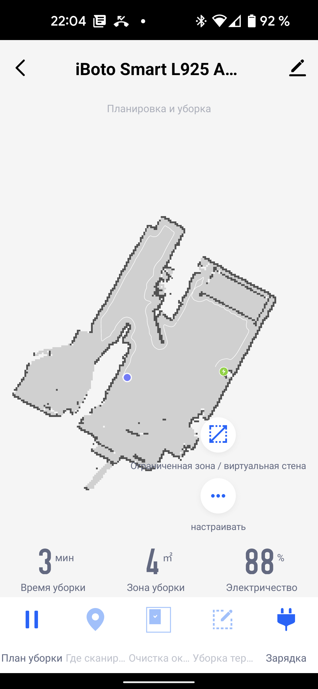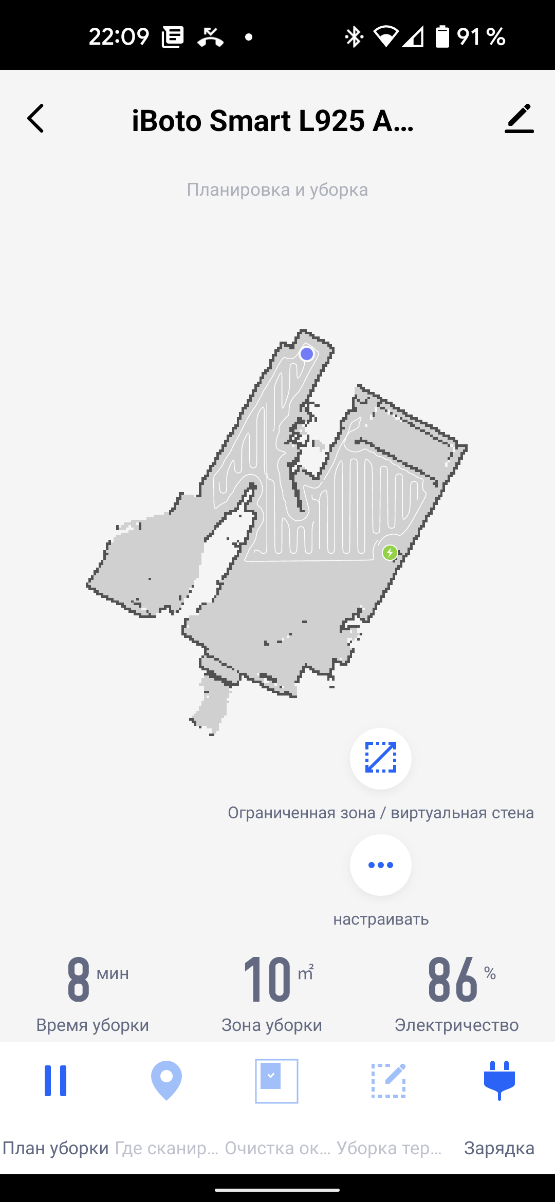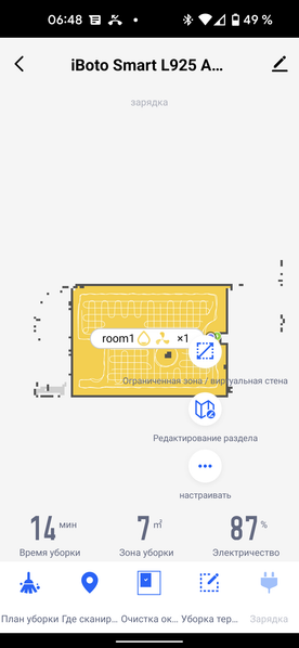 На главном экране приложения можно видеть карту помещения (как она выглядит с точки зрения робота), время текущей уборки, площадь, которую обошел прибор, и оставшийся процент заряда аккумулятора.