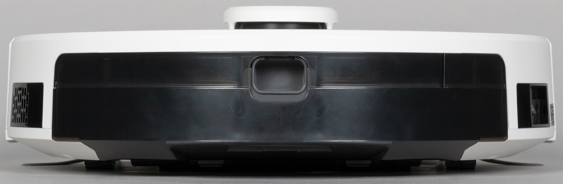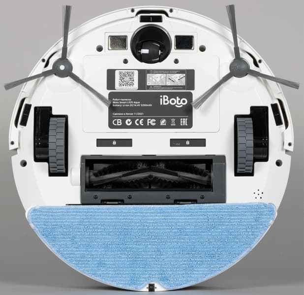 В остальном конструкция нижней части не отличается от подавляющего большинства аналогов: по периметру расположены датчики поверхности, защищающие устройство от падения с высоты, в центральной части — вращающаяся щетка, а между ней и направляющим колесом находится аккумуляторный отсек.