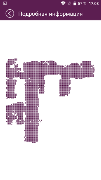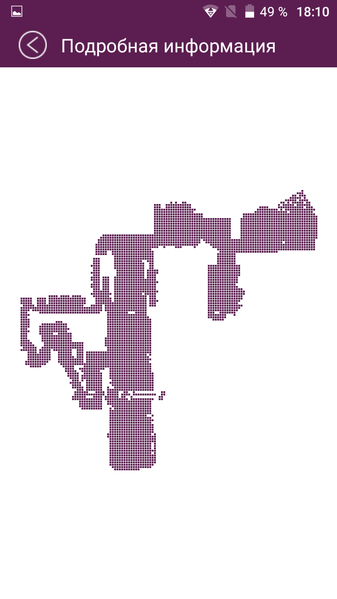 Робот работал на максимальной мощности всасывания в течение 71 минут, сообщил, что он уборку закончил и, немного заблудившись, вернулся на базу. Согласно нашим наблюдениям, робот хорошо убрал везде, за исключением верхних половин трех комнат на схеме выше. Видимо, в данном случае где-то на расстоянии 10-12 м от базы проходит граница, которую робот не пересекает. Снимок с экрана с картой согласуется с этим: