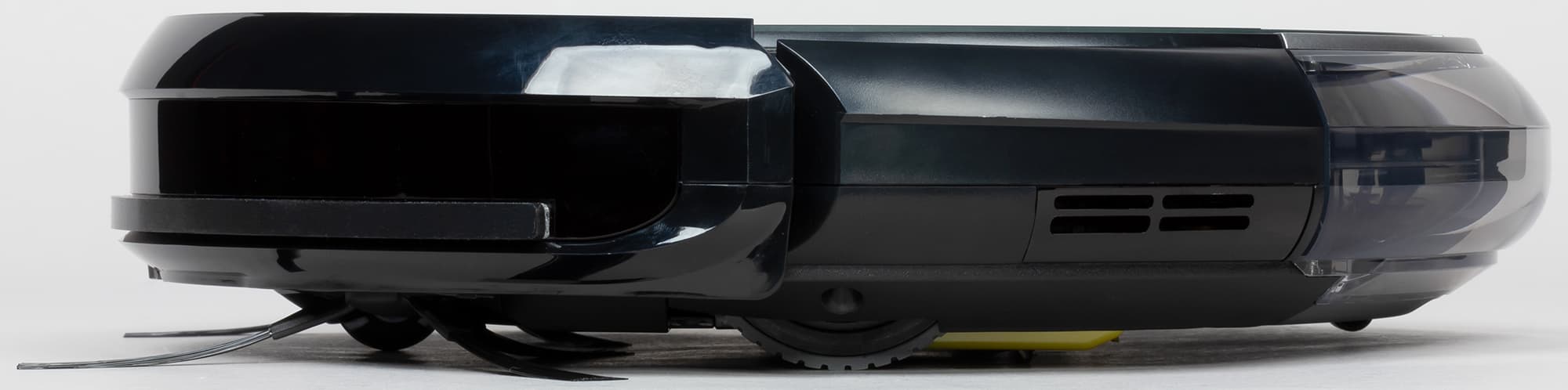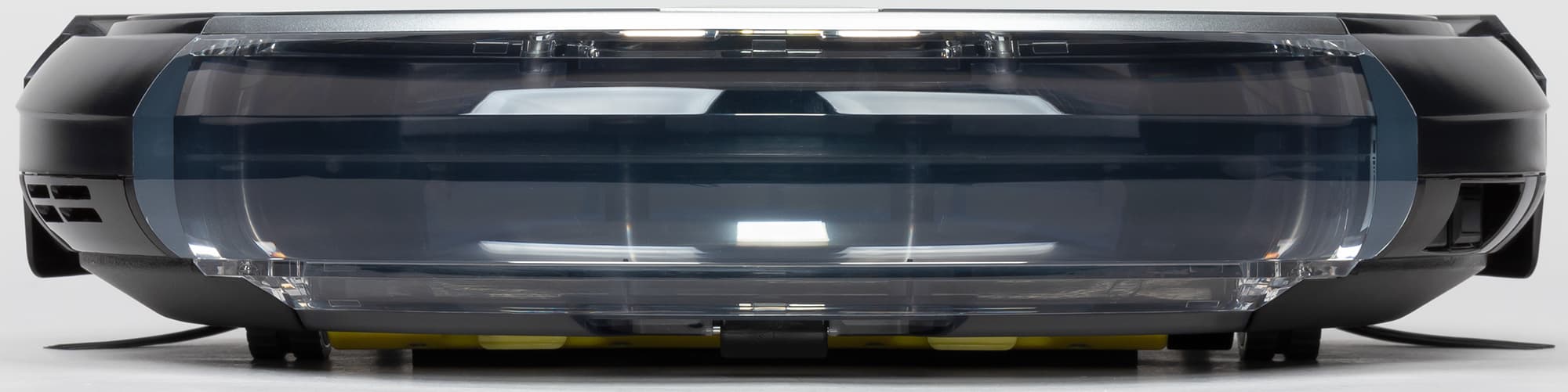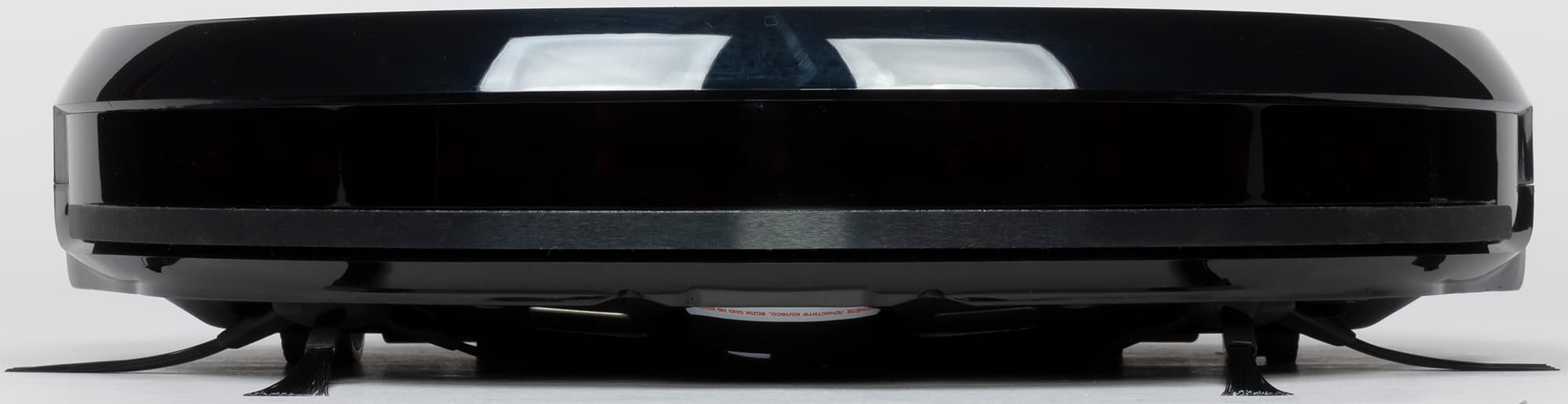 Сдвиг бампера вызывает срабатывание механических датчиков препятствий. Расстояние от пола до нижней точки бампера равно 16 мм, значит, на ступеньку такой высоты робот потенциально может заехать. Для защиты мебели спереди на бампер в нижней его части наклеена полоса из резины средней жесткости. Выше на бампере за окошком из тонированного пластика находятся ИК-датчики обнаружения препятствий, базовой станции и, возможно, приемник команд с пульта ДУ. Какие-то датчики, по всей видимости, также находятся за тонированными вставками на корпусе за бампером ближе к задней части пылесоса.