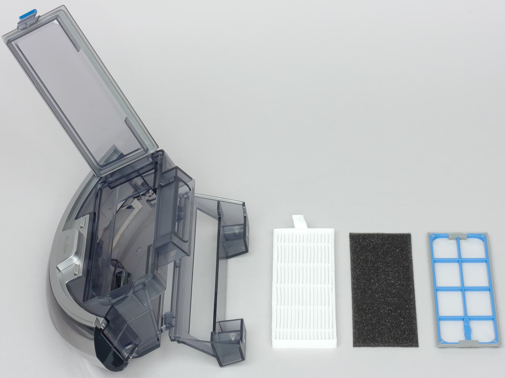Нажав на фиксатор сзади, можно отсоединить пылесборник от корпуса робота. Корпус пылесборника выполнен из слегка тонированного прозрачного пластика, но особой пользы это не приносит, так как взглянуть на него можно только или перевернув пылесос днищем вверх или вынув пылесборник. Передняя часть пылесборника откидывается на большой угол, что позволяет без труда вытряхнуть скопившийся мусор. Однако отсек для мусора относительно узкий и его будет неудобно чистить с помощью обычного пылесоса с короткой щелевой насадкой. Также передняя перегородка на откидывающейся части невысокая, поэтому мусор легко просыпается из закрытого пылесборника. Именно высота этой перегородки ограничивает полезную емкость пылесборника по отношению к тяжелому мусору. В закрытом положении передняя крышка удерживается магнитными фиксаторами. Для полной очистки нужно открыть верхнюю крышку пылесборника и вынуть сначала складчатый фильтр тонкой очистки, потом поролоновый фильтр и следом предварительный сетчатый фильтр.