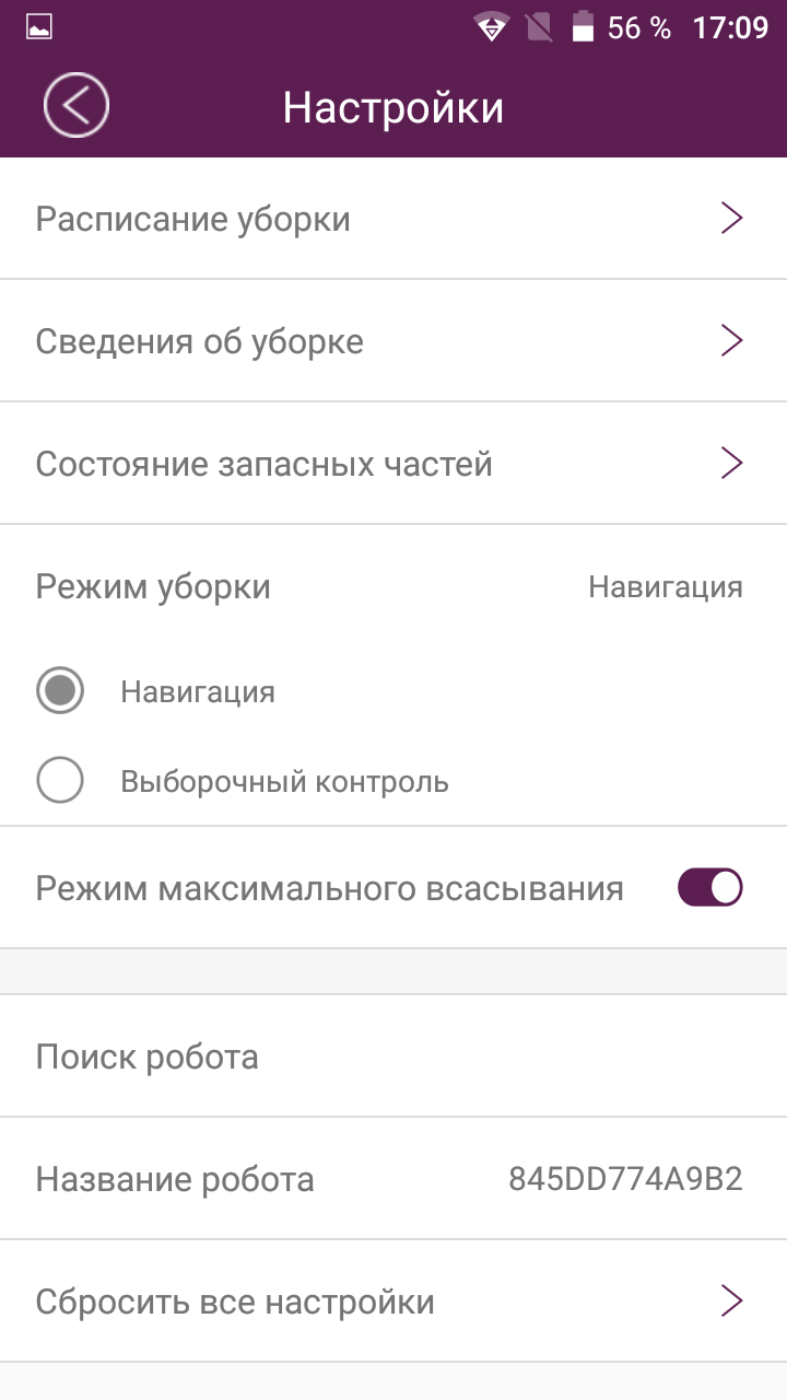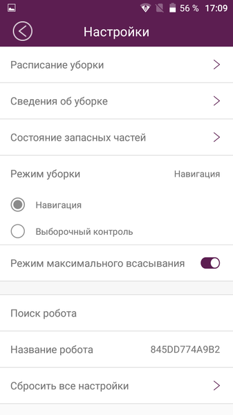 Фирменное приложение, устанавливаемое на мобильные устройства с Android (видимо, и iOS) на борту, расширяет функциональность робота. Запустив приложение первый раз, нужно установить связь с роботом, который должен быть в радиусе действия Wi-Fi-сети (и только 2,4 ГГц). Для управления роботом используется глобальный облачный сервис (необходима регистрация), поэтому доступ к роботу можно получить из любого места, где есть Сеть. В приложении удобно задавать расписание уборки (уже по дням недели), можно менять режим, управлять мощностью вентилятора, отслеживать ресурс щеток и фильтра, смотреть статистику уборок и любоваться на построенную роботом карту помещения. Функция Поиск робота поможет найти робота — он подаст звуковые сигналы. Также приложение можно использовать в качестве пульта ДУ для управления движением робота.