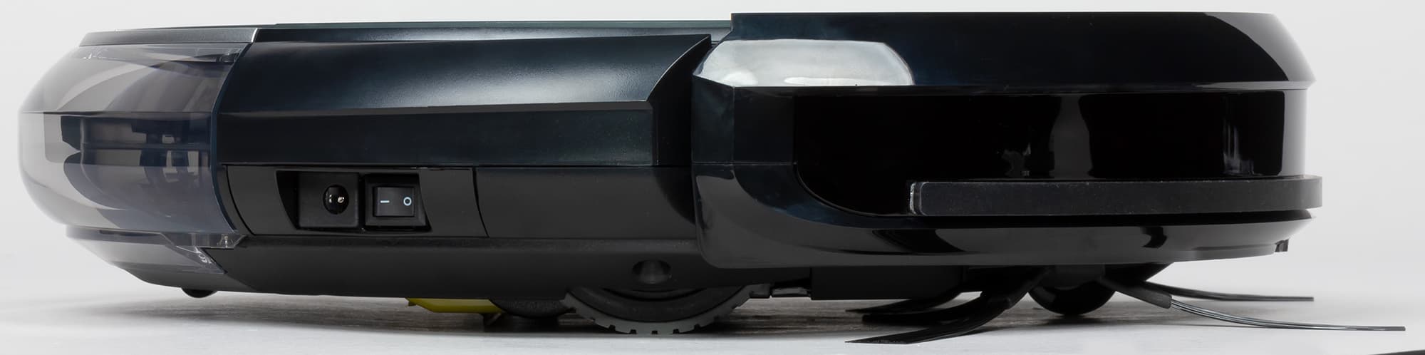 На днище расположены две контактные площадки, передний опорный поворотный ролик, боковые щеточки, крышка батарейного отсека, два ведущих колеса, отсек основной щетки. Ближе к краю сразу за бампером расположены три ИК-датчика перепада высоты, благодаря которым робот-пылесос может избежать падения со ступенек.