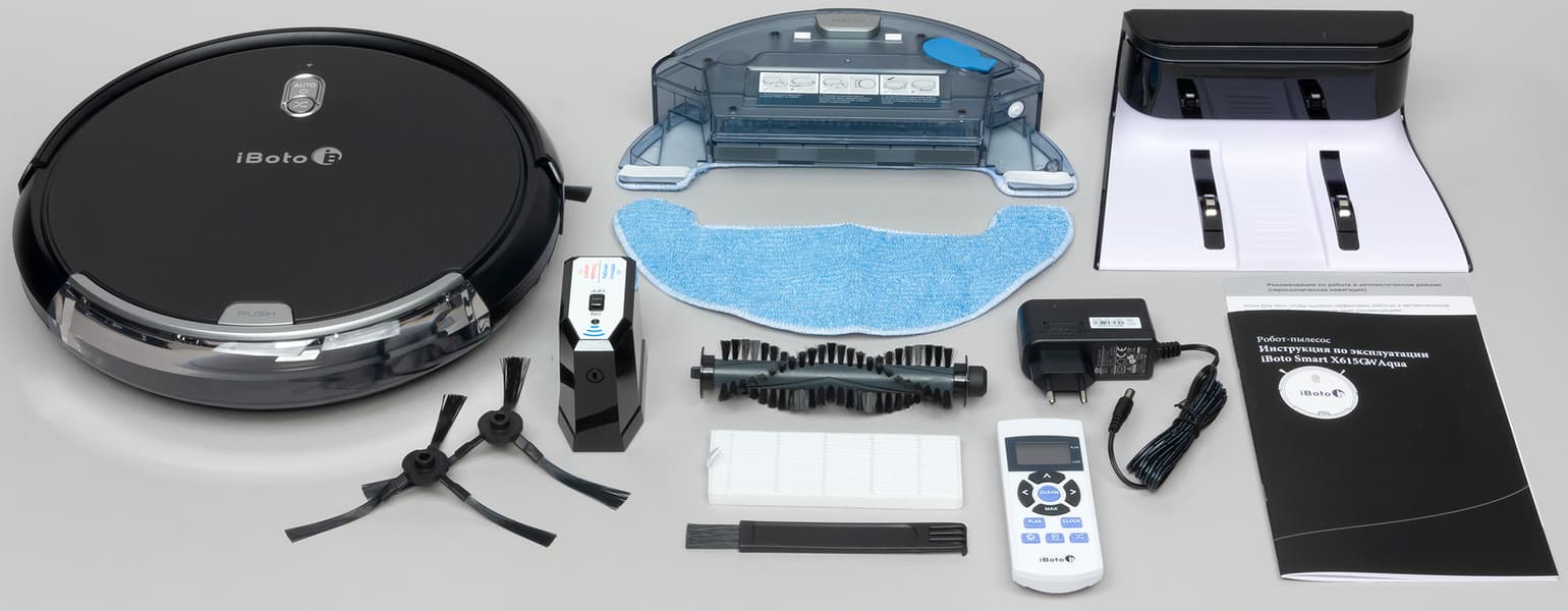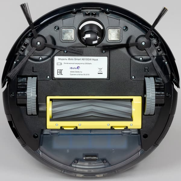В автоматическом режиме iBoto Smart X615GW Aqua последовательно, участок за участком, убирает доступную ему площадь помещения и возвращается на базу для зарядки аккумулятора. Качество уборки в этом режиме достаточно высокое. При необходимости пользователь может увеличить мощность вентилятора, активировать классический режим уборки со случайным характером движения, вручную управлять движением робота, включать режим интенсивной очистки локального участка, также робота можно запрограммировать на уборку по расписанию. Функциональность робота дополнена способностью выполнять влажную уборку гладких полов. В комплекте поставки есть вторая безворсовая резиновая щетка, на которую в меньшей степени наматываются волосы, шерсть, нитки и пр., это особенно оценят владельцы домашних животных.